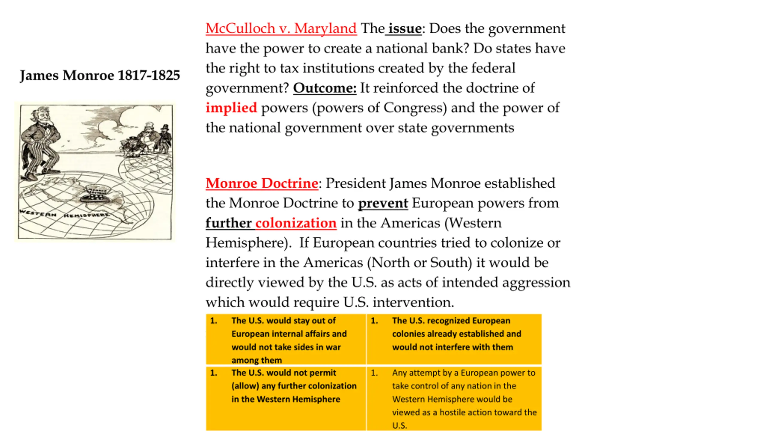 McCulloch v. Maryland The issue: Does the government have the power to create a national bank? Do states have the right to tax institutions created by the federal government? Outcome: It reinforced the doctrine of implied powers (powers of Congress) and the power of the national government over state governments James Monroe 1817-1825 Monroe Doctrine: President James Monroe established the Monroe Doctrine to prevent European powers from further colonization in the Americas (Western Hemisphere). If European countries tried to colonize or interfere in the Americas (North or South) it would be directly viewed by the U.S. as acts of intended aggression which would require U.S. intervention. 1. The U.S. would stay out of 1. The U.S. recognized European colonies already established and would not interfere with them 4 main points of the Monroe Doctrine European internal affairs and would not take sides in war among them 1. The U.S. would not permit (allow) any further colonization in the Western Hemisphere 1. Any attempt by a European power to take control of any nation in the Western Hemisphere would be viewed as a hostile action toward the U.S.