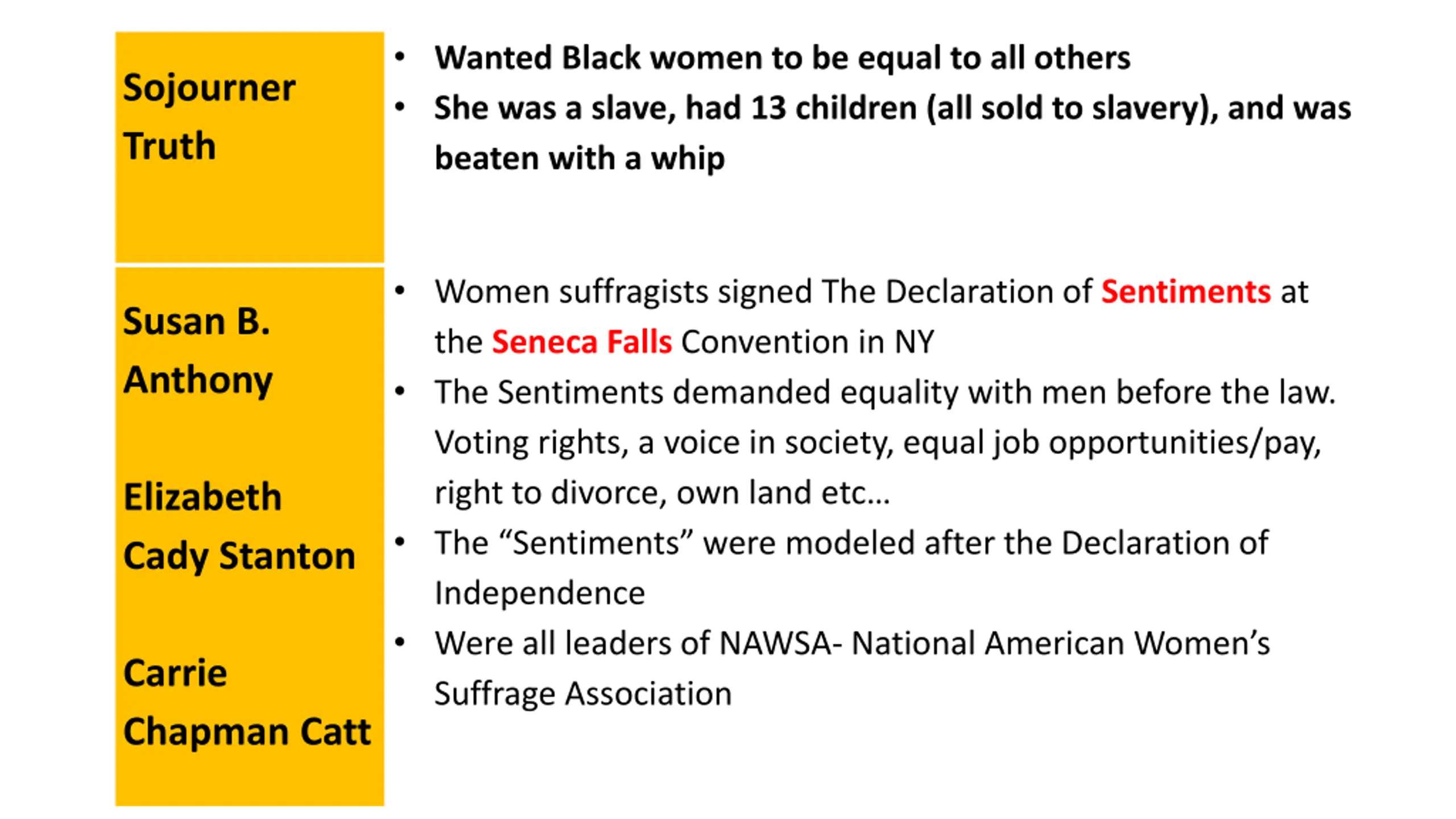 Wanted Black women to be equal to all others She was a slave, had 13 children (all sold to slavery), and was beaten with a whip Sojourner Truth Women suffragists signed The Declaration of Sentiments at the Seneca Falls Convention in NY The Sentiments demanded equality with men before the law. Voting rights, a voice in society, equal job opportunities/pay, right to divorce, own land etc The Sentiments were modeled after the Declaration of Independence Were all leaders of NAWSA- National American Women s Suffrage Association Susan B. Anthony Elizabeth Cady Stanton Carrie Chapman Catt