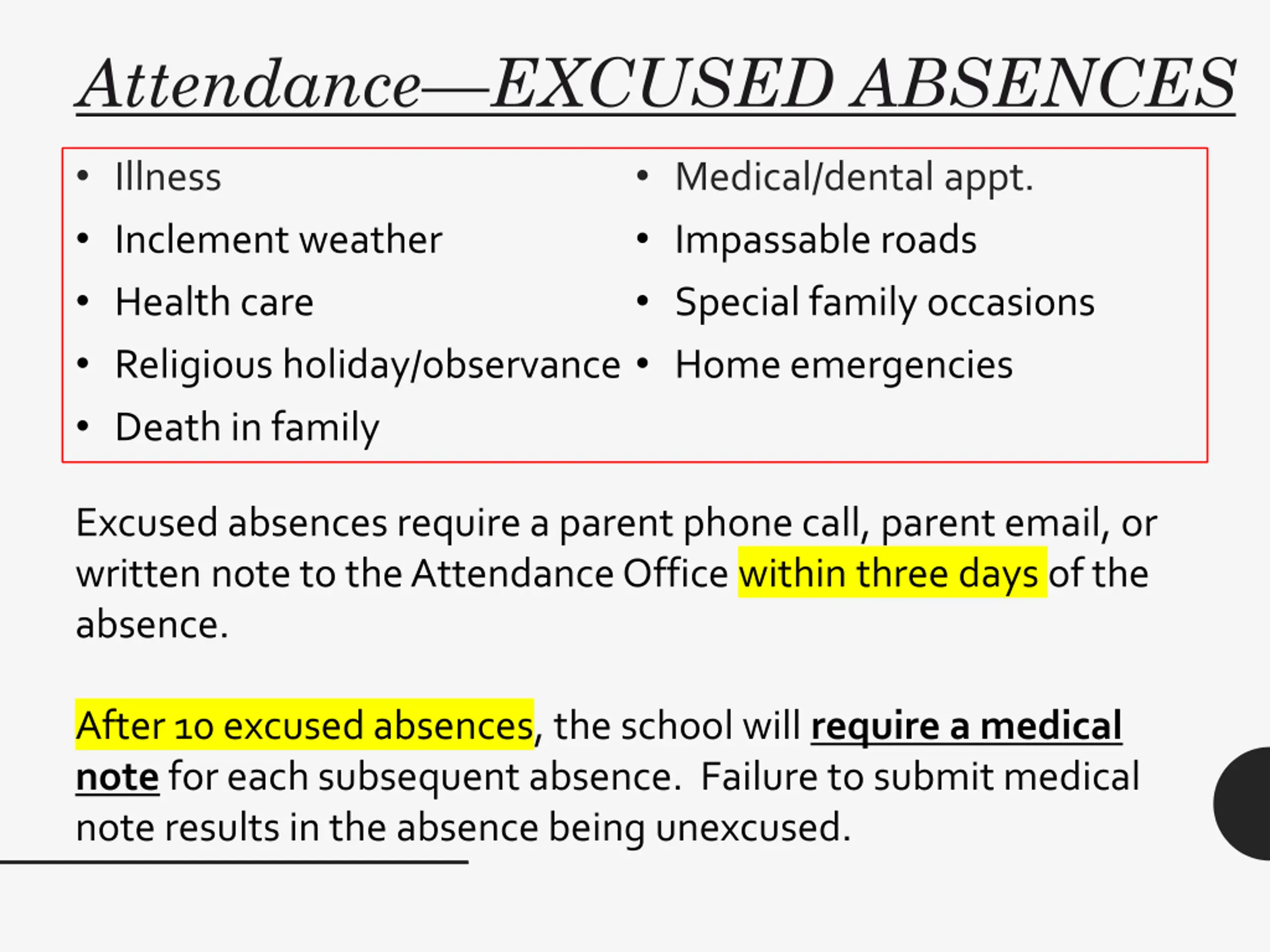 AttendanceEXCUSED ABSENCES Illness Inclement weather Health care Religious holiday/observance Death in family Medical/dental appt. Impassable roads Special family occasions Home emergencies Excused absences require a parent phone call, parent email, or written note to the Attendance Office within three days of the absence. After 10 excused absences, the school will require a medical note for each subsequent absence. Failure to submit medical note results in the absence being unexcused.