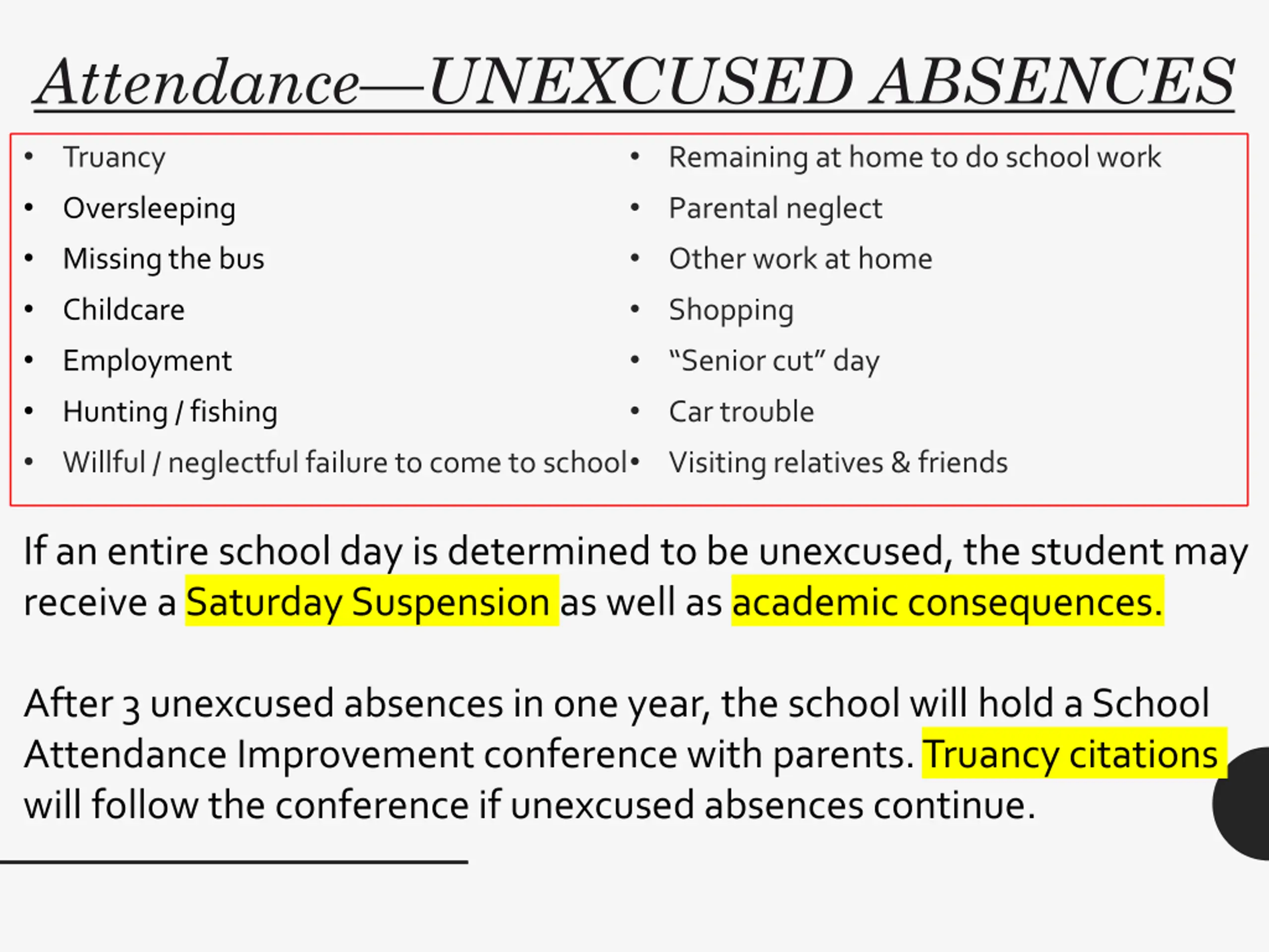 AttendanceUNEXCUSED ABSENCES Truancy Oversleeping Missing the bus Childcare Employment Hunting / fishing Willful / neglectful failure to come to school Remaining at home to do school work Parental neglect Other work at home Shopping Senior cut day Car trouble Visiting relatives & friends If an entire school day is determined to be unexcused, the student may receive a Saturday Suspension as well as academic consequences. After 3 unexcused absences in one year, the school will hold a School Attendance Improvement conference with parents. Truancy citations will follow the conference if unexcused absences continue.