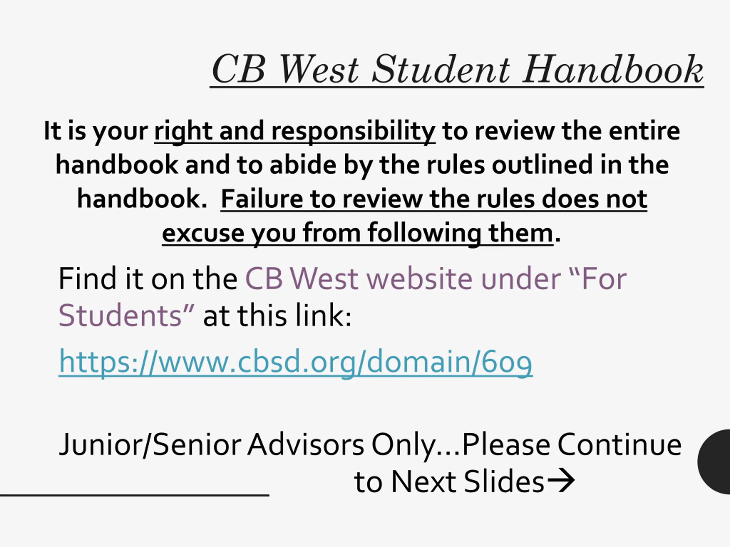 CB West Student Handbook It is your right and responsibility to review the entire handbook and to abide by the rules outlined in the handbook. Failure to review the rules does not excuse you from following them. Find it on the CB West website under For Students at this link: https://www.cbsd.org/domain/609 Junior/Senior Advisors Only Please Continue to Next Slides