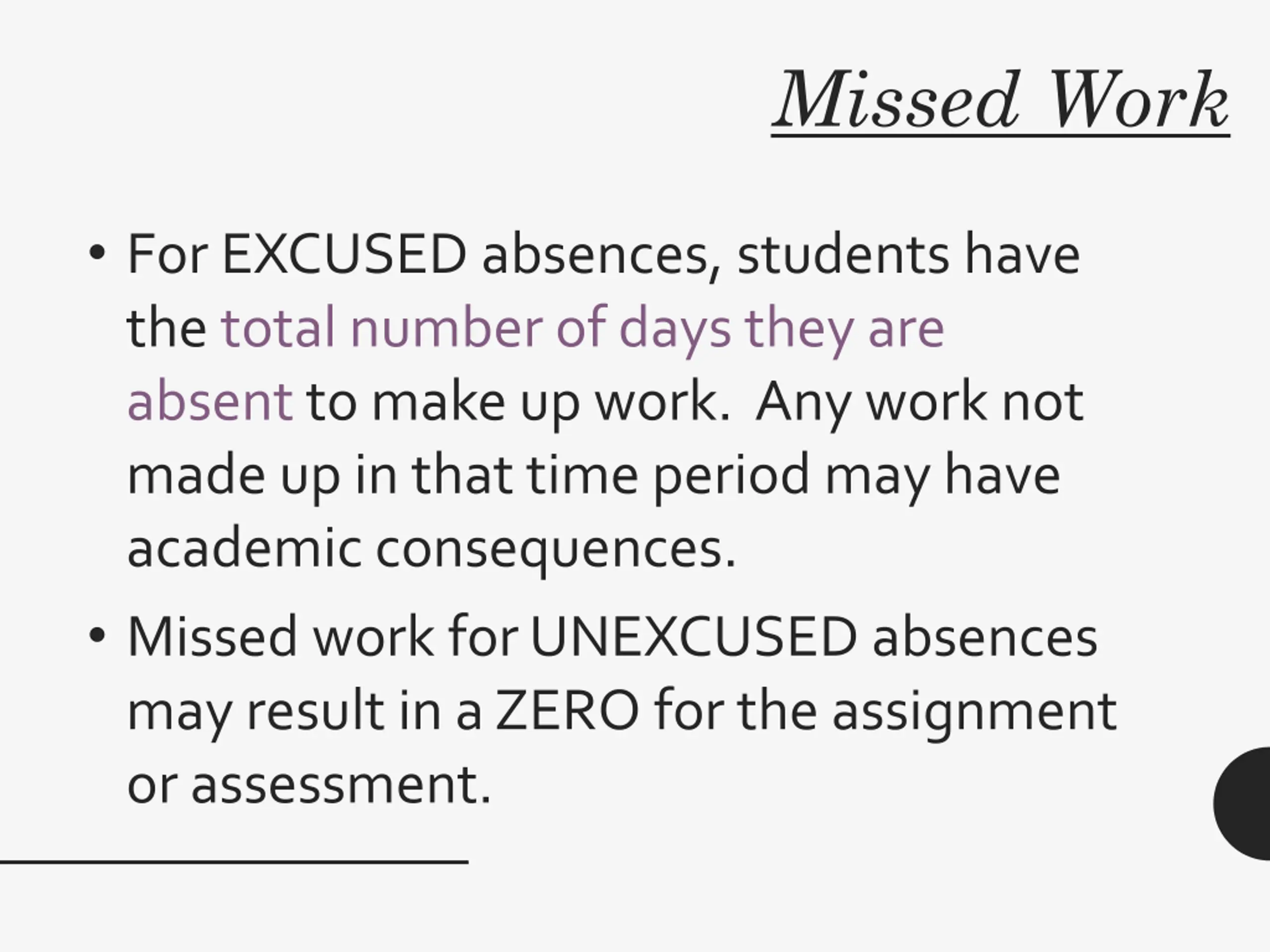 Missed Work For EXCUSED absences, students have the total number of days they are absent to make up work. Any work not made up in that time period may have academic consequences. Missed work for UNEXCUSED absences may result in a ZERO for the assignment or assessment.