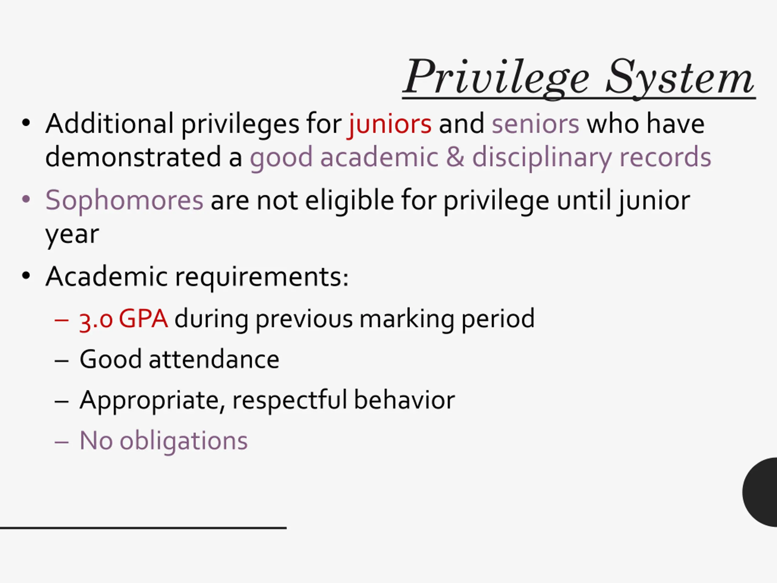 Privilege System Additional privileges for juniors and seniors who have demonstrated a good academic & disciplinary records Sophomores are not eligible for privilege until junior year Academic requirements: 3.0 GPA during previous marking period Good attendance Appropriate, respectful behavior No obligations