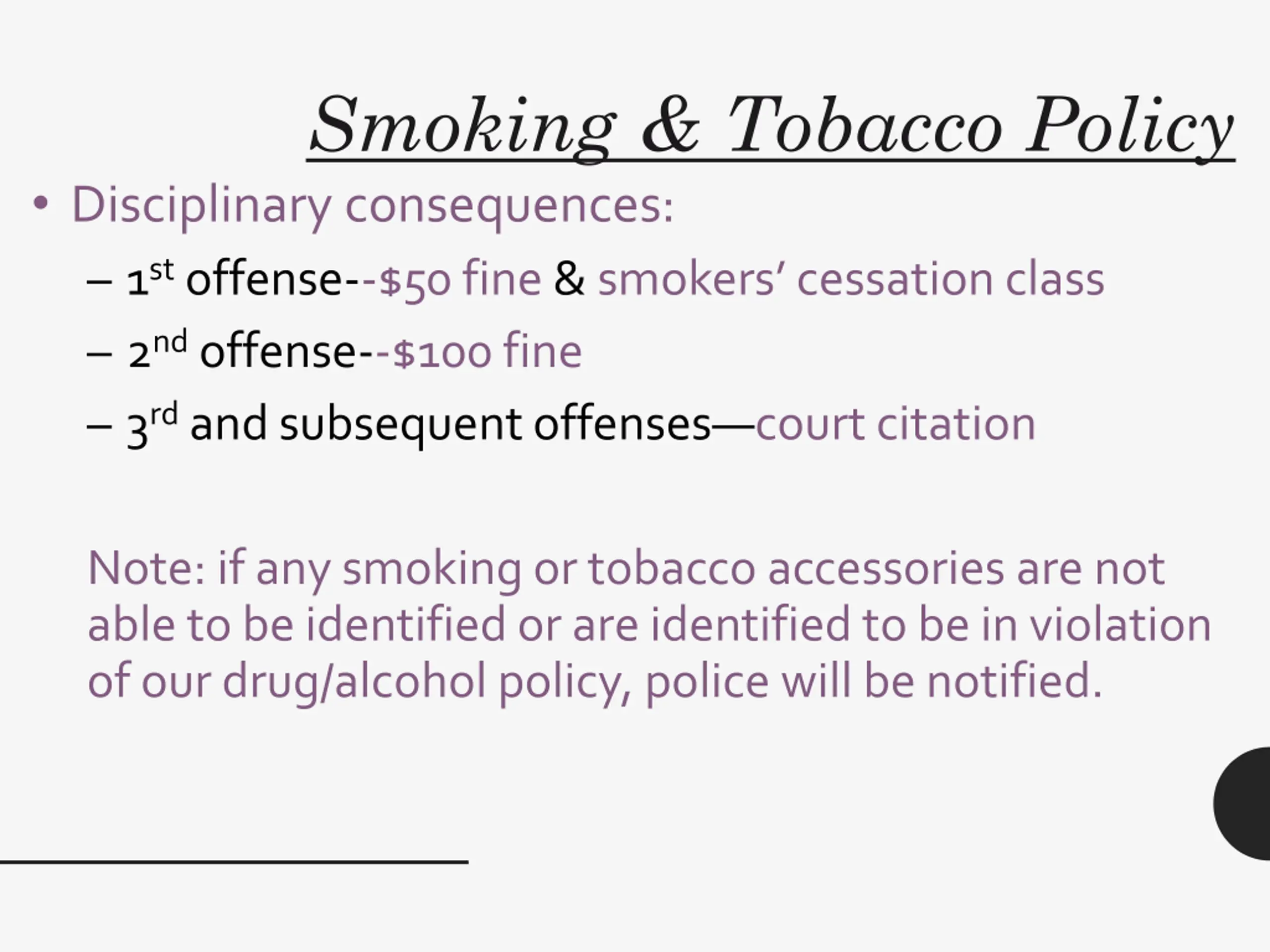 Smoking & Tobacco Policy Disciplinary consequences: 1st offense--$50 fine & smokers cessation class 2nd offense--$100 fine 3rd and subsequent offenses court citation Note: if any smoking or tobacco accessories are not able to be identified or are identified to be in violation of our drug/alcohol policy, police will be notified.