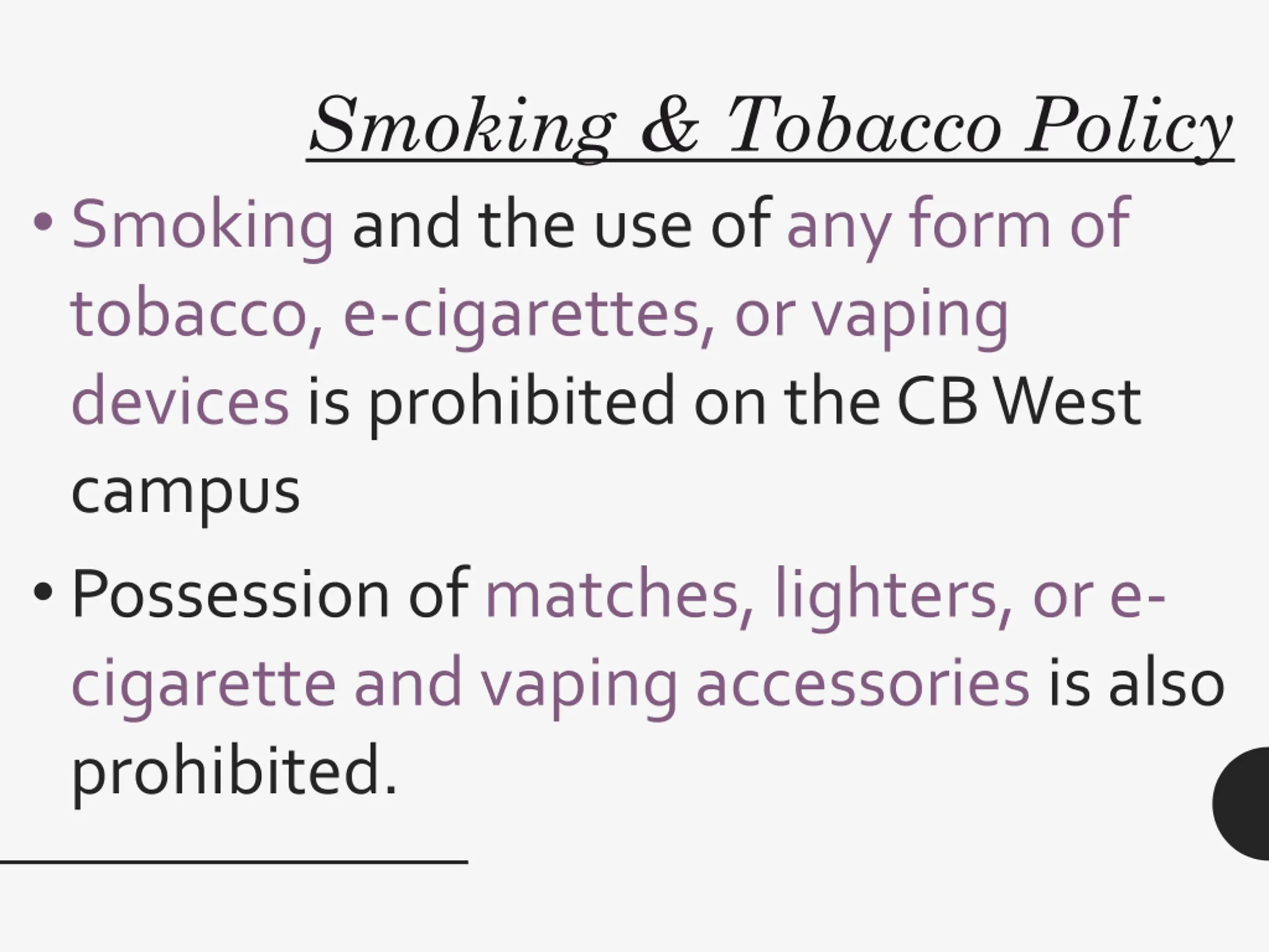 Smoking & Tobacco Policy Smoking and the use of any form of tobacco, e-cigarettes, or vaping devices is prohibited on the CB West campus Possession of matches, lighters, or e- cigarette and vaping accessories is also prohibited.