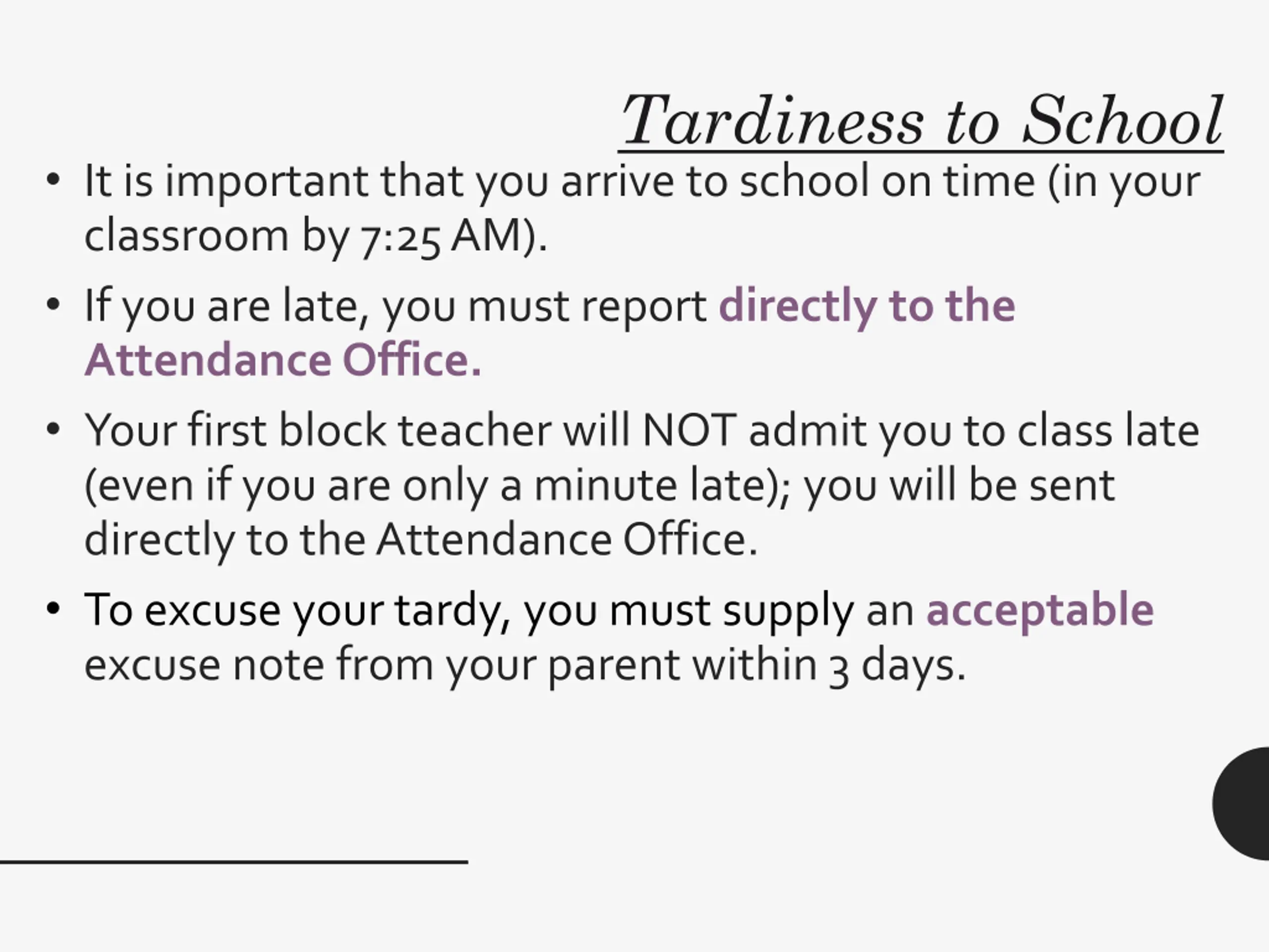 Tardiness to School It is important that you arrive to school on time (in your classroom by 7:25 AM). If you are late, you must report directly to the Attendance Office. Your first block teacher will NOT admit you to class late (even if you are only a minute late); you will be sent directly to the Attendance Office. To excuse your tardy, you must supply an acceptable excuse note from your parent within 3 days.