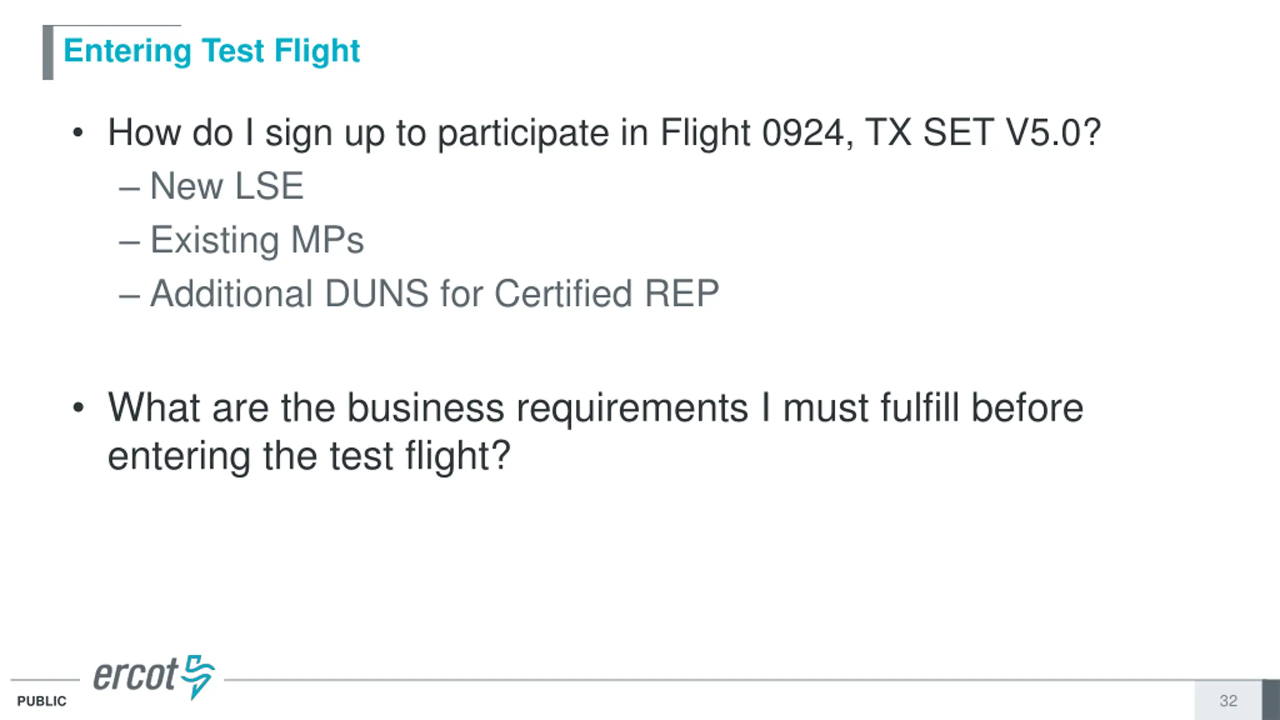 Entering Test Flight How do I sign up to participate in Flight 0924, TX SET V5.0? New LSE Existing MPs Additional DUNS for Certified REP What are the business requirements I must fulfill before entering the test flight? 32 PUBLIC