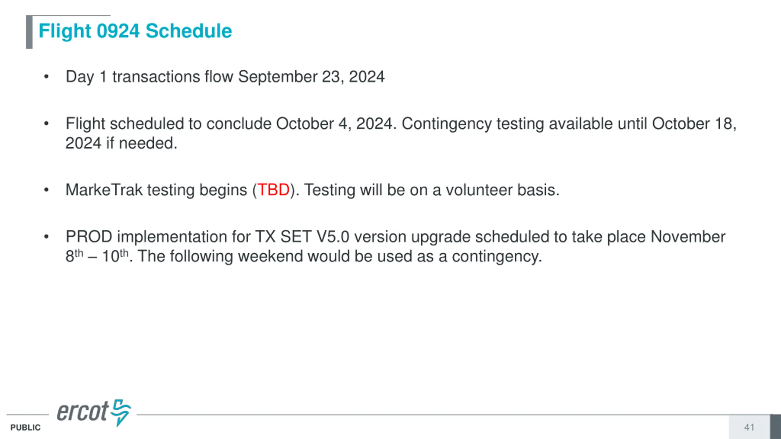 Flight 0924 Schedule Day 1 transactions flow September 23, 2024 Flight scheduled to conclude October 4, 2024. Contingency testing available until October 18, 2024 if needed. MarkeTrak testing begins (TBD). Testing will be on a volunteer basis. PROD implementation for TX SET V5.0 version upgrade scheduled to take place November 8th 10th. The following weekend would be used as a contingency. 41 PUBLIC
