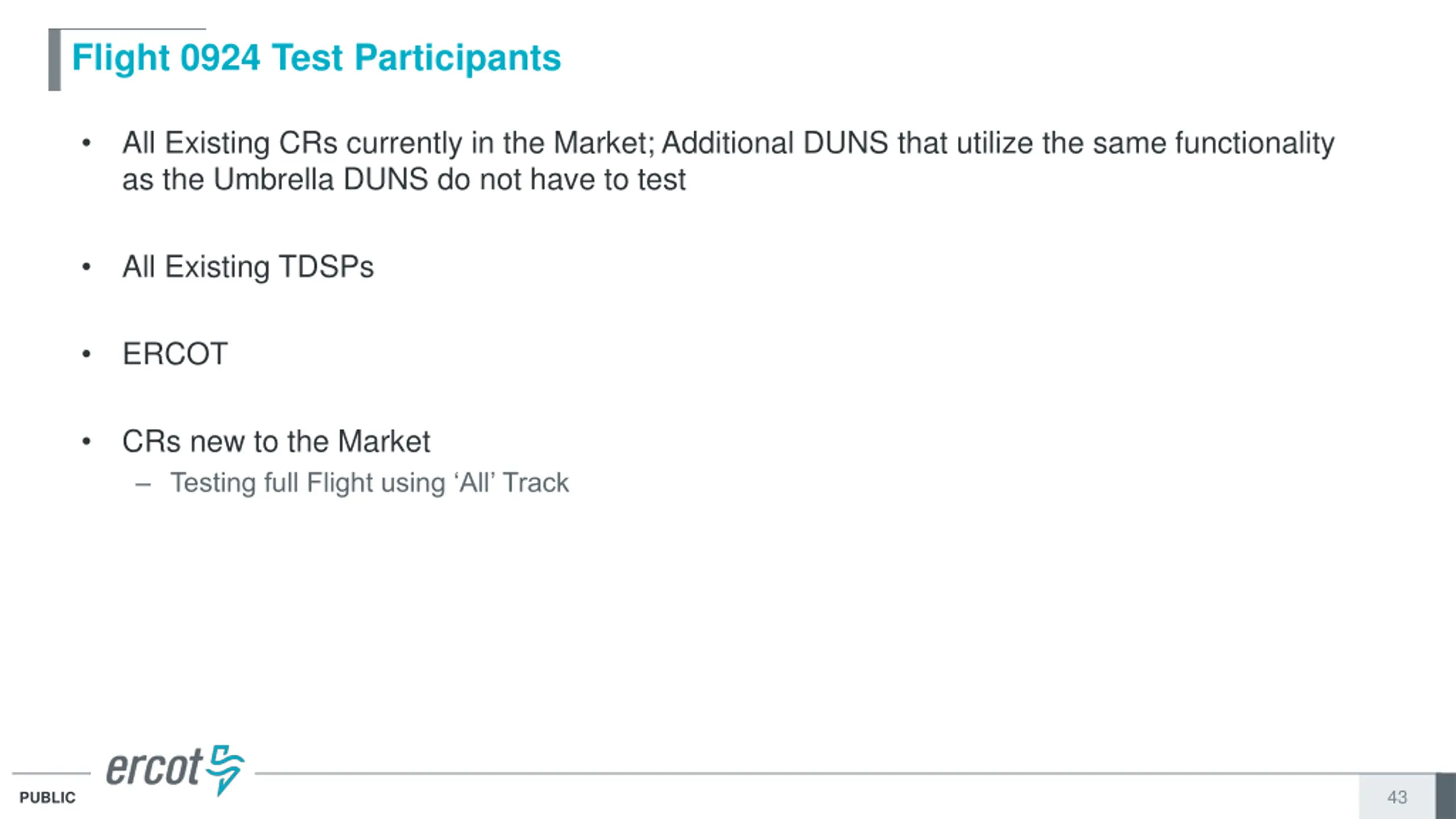 Flight 0924 Test Participants All Existing CRs currently in the Market; Additional DUNS that utilize the same functionality as the Umbrella DUNS do not have to test All Existing TDSPs ERCOT CRs new to the Market Testing full Flight using All Track 43 PUBLIC