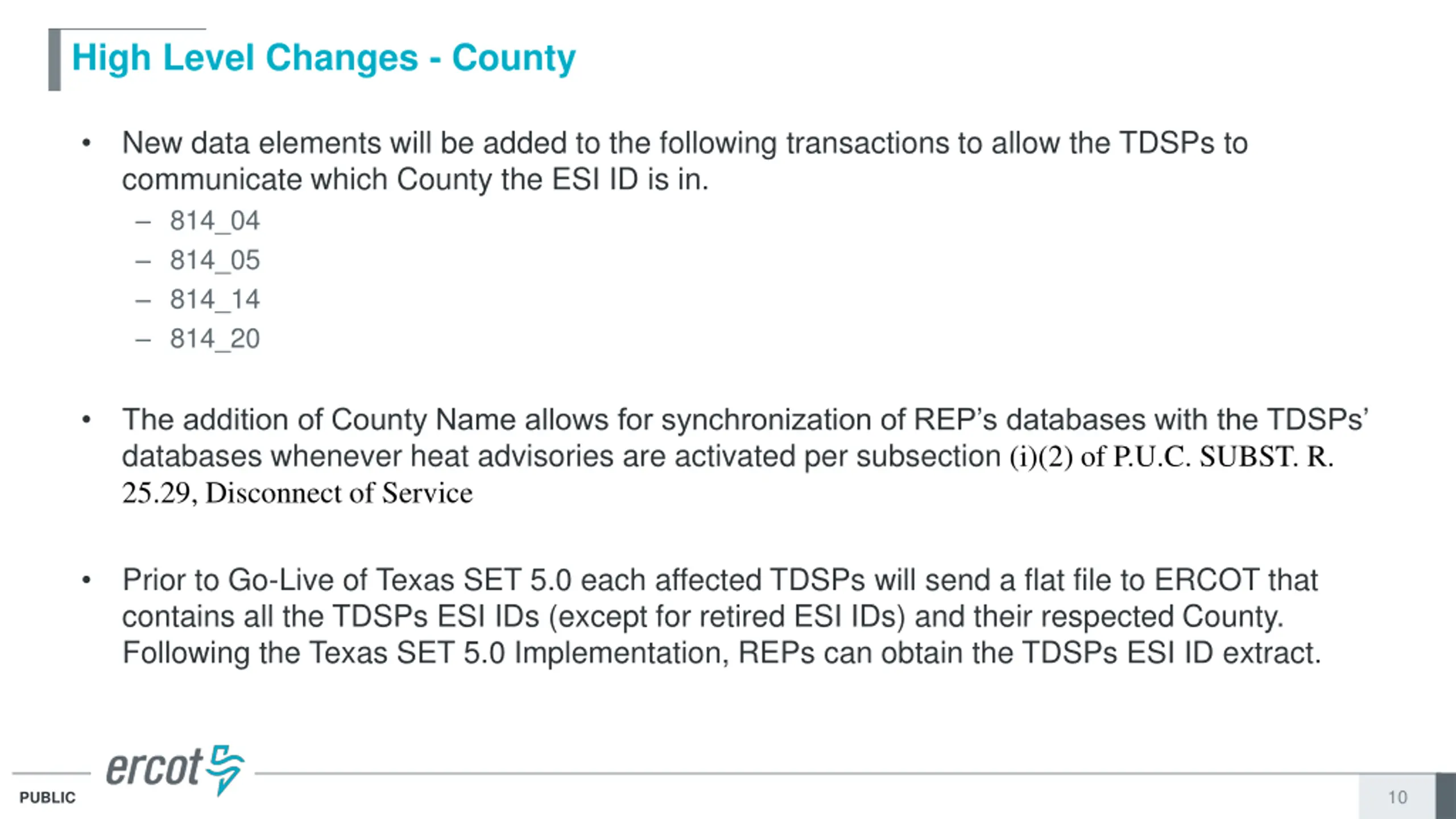 High Level Changes - County New data elements will be added to the following transactions to allow the TDSPs to communicate which County the ESI ID is in. 814_04 814_05 814_14 814_20 The addition of County Name allows for synchronization of REP s databases with the TDSPs databases whenever heat advisories are activated per subsection (i)(2) of P.U.C. SUBST. R. 25.29, Disconnect of Service Prior to Go-Live of Texas SET 5.0 each affected TDSPs will send a flat file to ERCOT that contains all the TDSPs ESI IDs (except for retired ESI IDs) and their respected County. Following the Texas SET 5.0 Implementation, REPs can obtain the TDSPs ESI ID extract. 10 PUBLIC