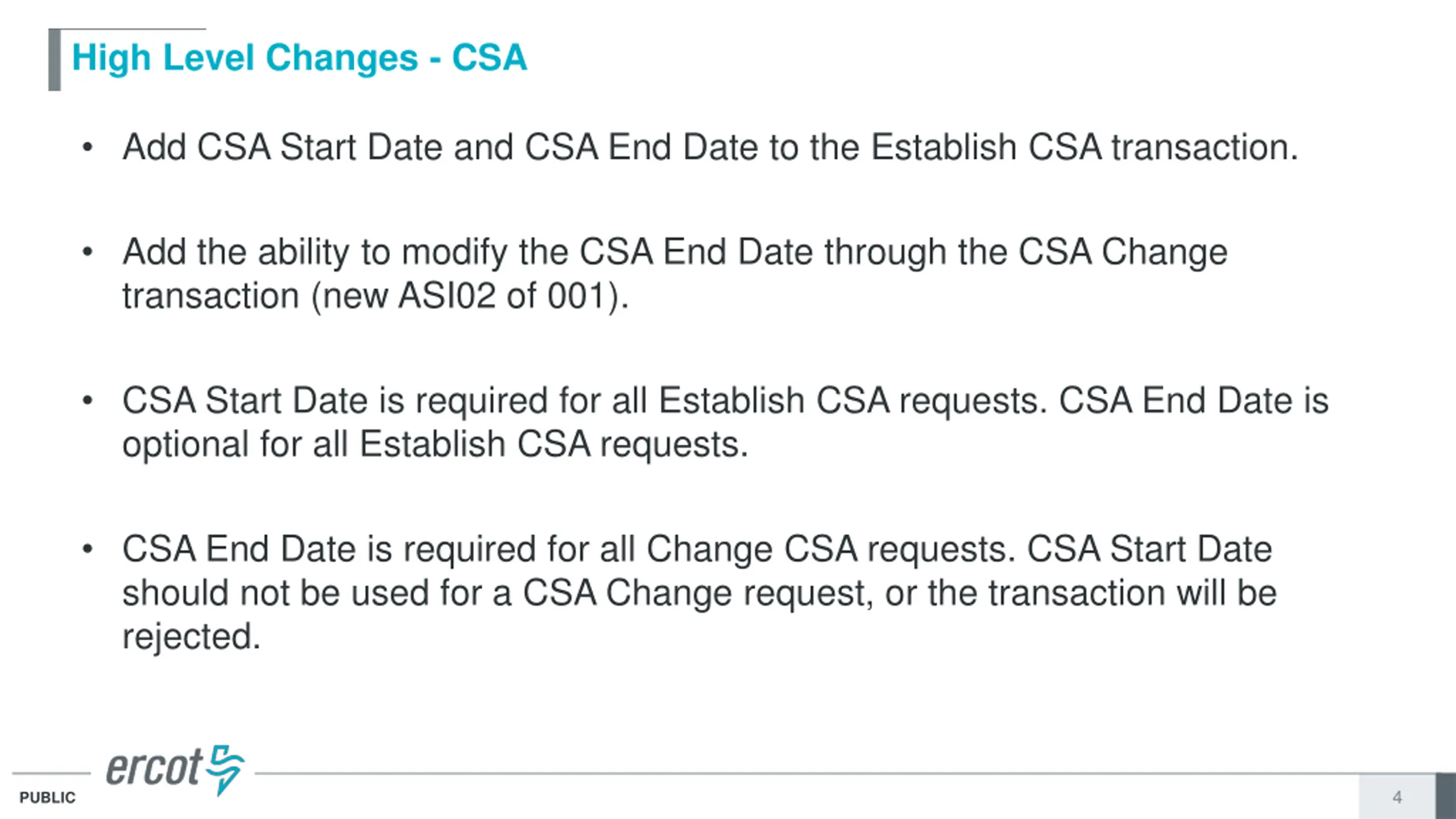 High Level Changes - CSA Add CSA Start Date and CSA End Date to the Establish CSA transaction. Add the ability to modify the CSA End Date through the CSA Change transaction (new ASI02 of 001). CSA Start Date is required for all Establish CSA requests. CSA End Date is optional for all Establish CSA requests. CSA End Date is required for all Change CSA requests. CSA Start Date should not be used for a CSA Change request, or the transaction will be rejected. 4 PUBLIC