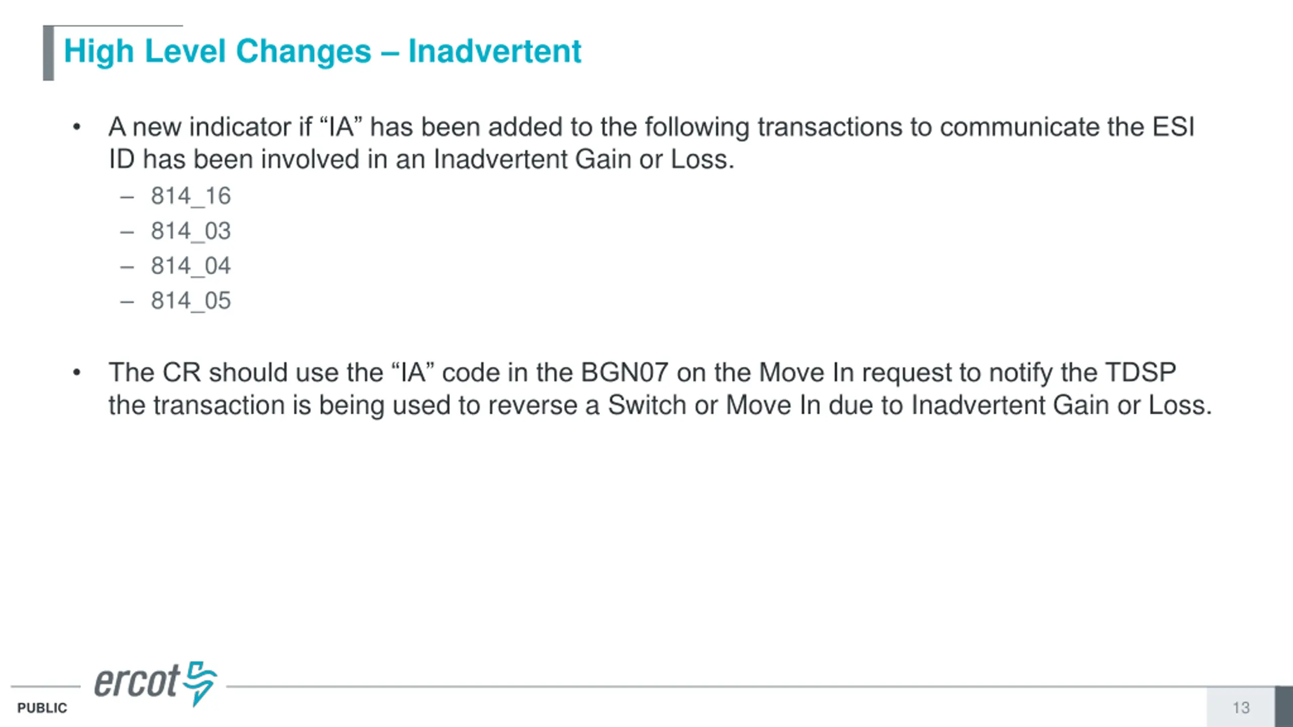 High Level Changes Inadvertent A new indicator if IA has been added to the following transactions to communicate the ESI ID has been involved in an Inadvertent Gain or Loss. 814_16 814_03 814_04 814_05 The CR should use the IA code in the BGN07 on the Move In request to notify the TDSP the transaction is being used to reverse a Switch or Move In due to Inadvertent Gain or Loss. 13 PUBLIC
