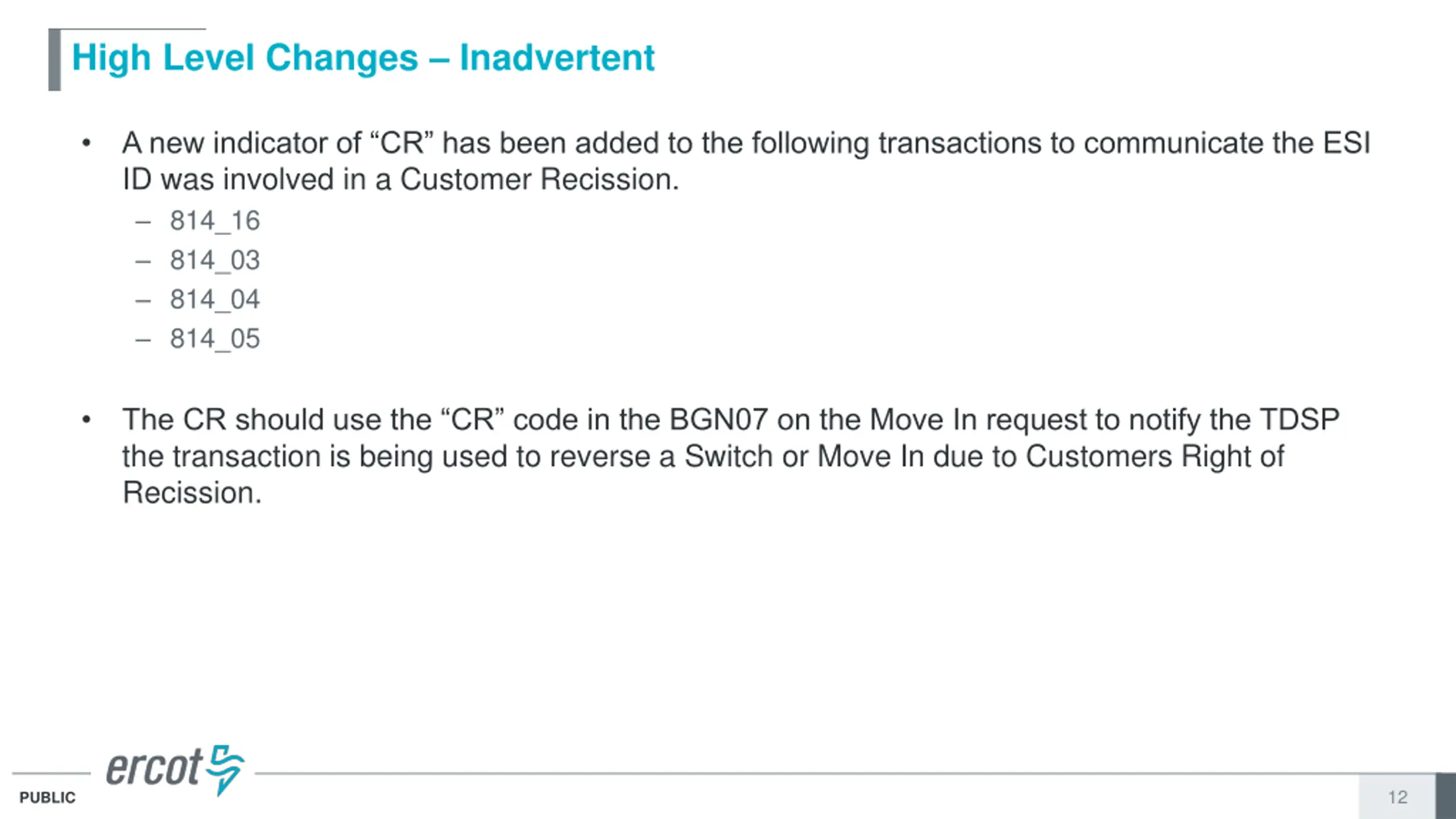 High Level Changes Inadvertent A new indicator of CR has been added to the following transactions to communicate the ESI ID was involved in a Customer Recission. 814_16 814_03 814_04 814_05 The CR should use the CR code in the BGN07 on the Move In request to notify the TDSP the transaction is being used to reverse a Switch or Move In due to Customers Right of Recission. 12 PUBLIC