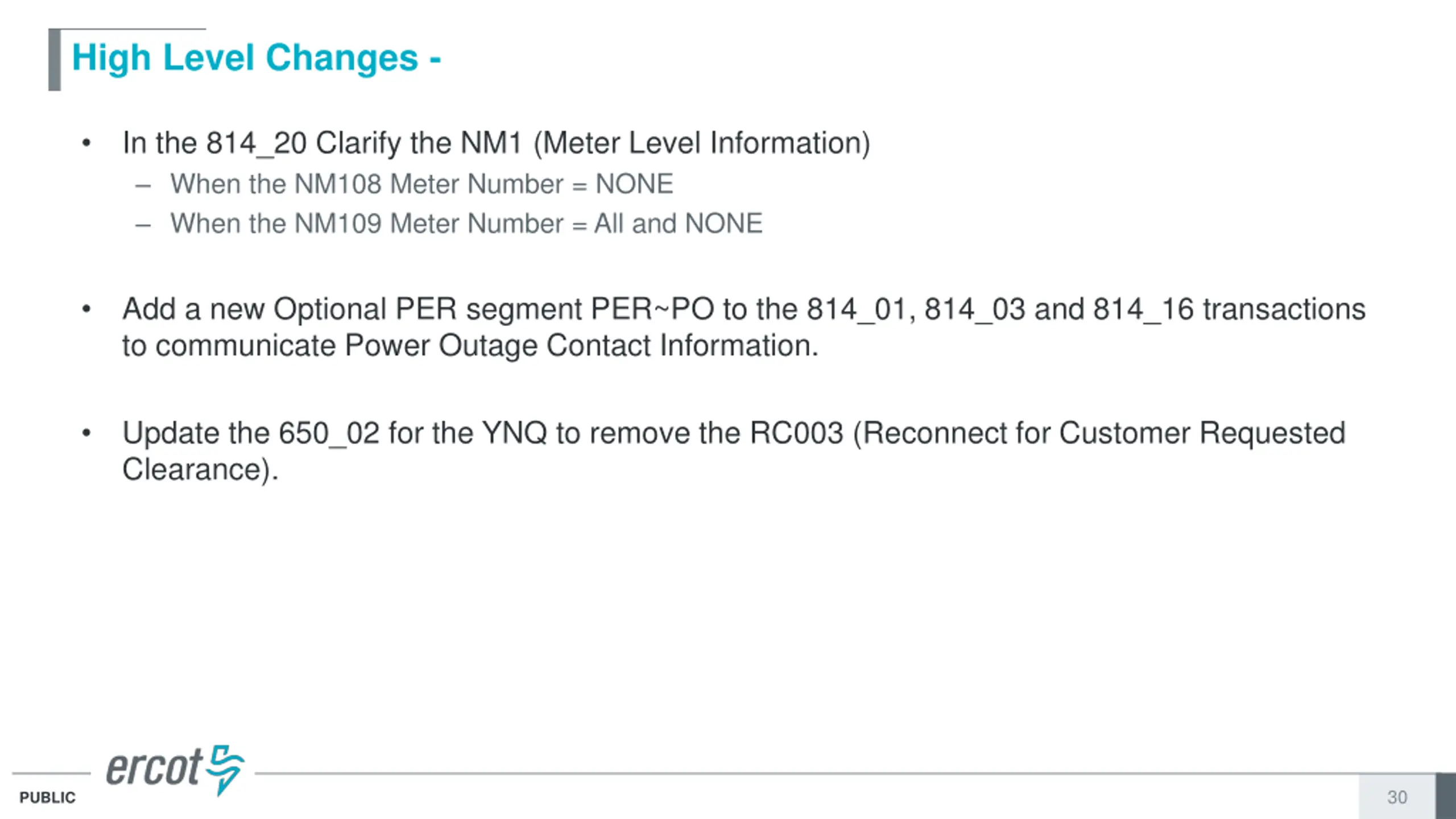 High Level Changes - In the 814_20 Clarify the NM1 (Meter Level Information) When the NM108 Meter Number = NONE When the NM109 Meter Number = All and NONE Add a new Optional PER segment PER~PO to the 814_01, 814_03 and 814_16 transactions to communicate Power Outage Contact Information. Update the 650_02 for the YNQ to remove the RC003 (Reconnect for Customer Requested Clearance). 30 PUBLIC