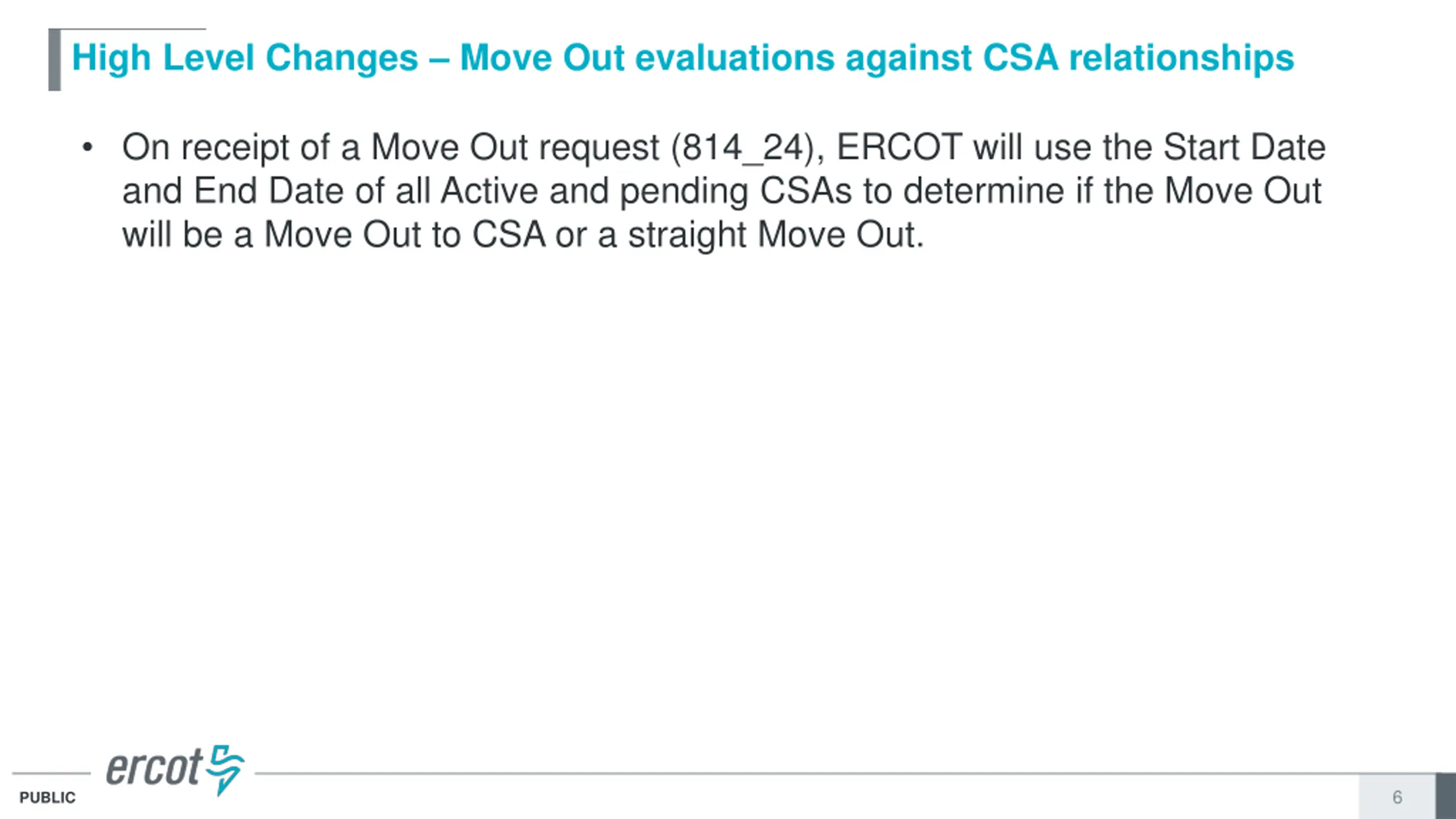 High Level Changes Move Out evaluations against CSA relationships On receipt of a Move Out request (814_24), ERCOT will use the Start Date and End Date of all Active and pending CSAs to determine if the Move Out will be a Move Out to CSA or a straight Move Out. 6 PUBLIC