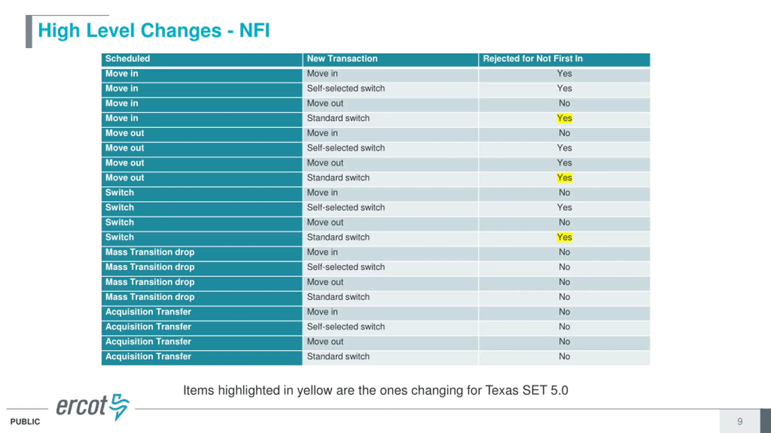 High Level Changes - NFI Scheduled Move in Move in Move in Move in Move out Move out Move out Move out Switch Switch Switch Switch Mass Transition drop Mass Transition drop Mass Transition drop Mass Transition drop Acquisition Transfer Acquisition Transfer Acquisition Transfer Acquisition Transfer New Transaction Move in Rejected for Not First In Yes Self-selected switch Yes Move out No Standard switch Yes Move in No Self-selected switch Yes Move out Yes Standard switch Yes Move in No Self-selected switch Yes Move out No Standard switch Yes Move in No Self-selected switch No Move out No Standard switch No Move in No Self-selected switch No Move out No Standard switch No Items highlighted in yellow are the ones changing for Texas SET 5.0 9 PUBLIC