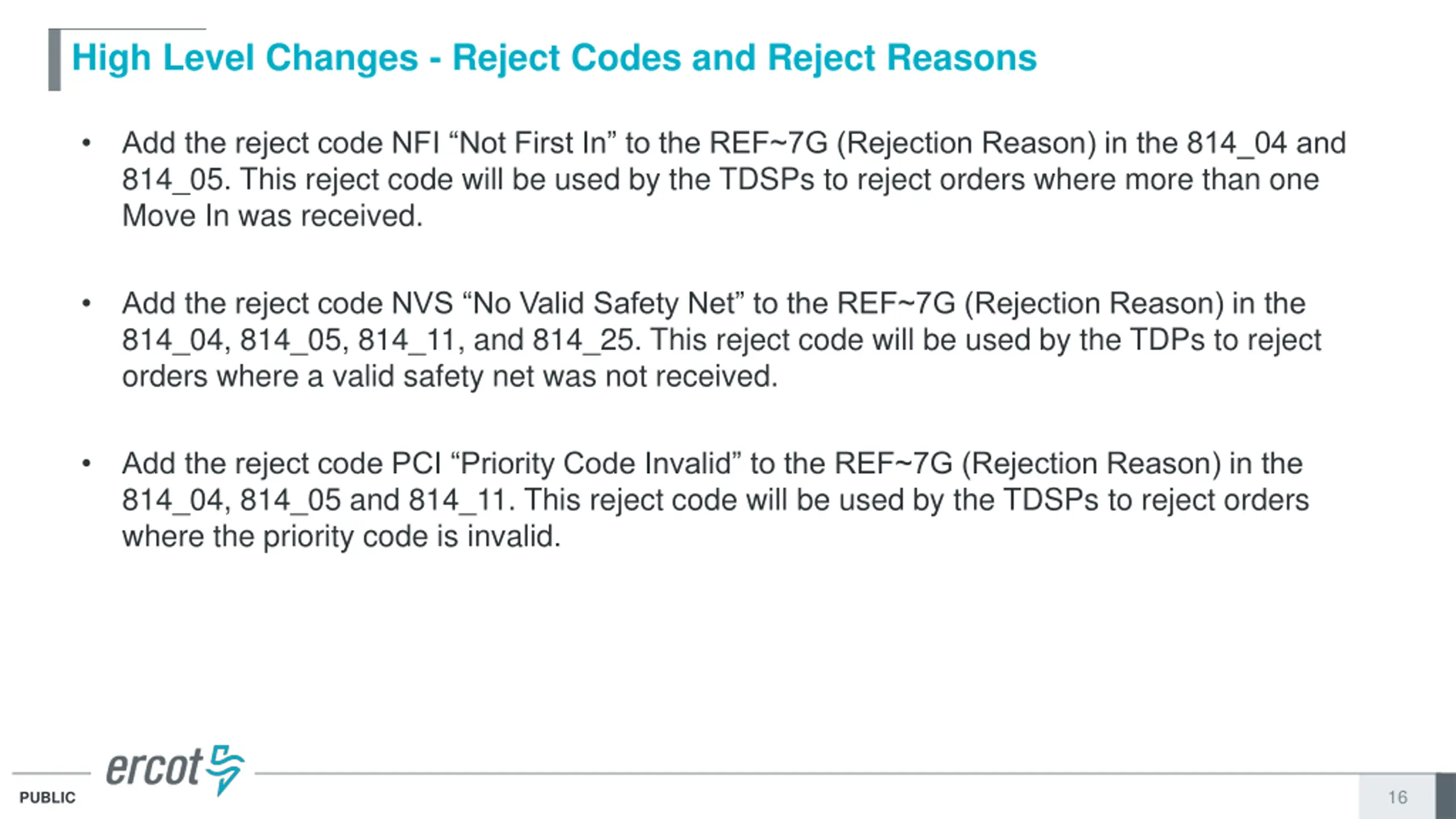 High Level Changes - Reject Codes and Reject Reasons Add the reject code NFI Not First In to the REF~7G (Rejection Reason) in the 814_04 and 814_05. This reject code will be used by the TDSPs to reject orders where more than one Move In was received. Add the reject code NVS No Valid Safety Net to the REF~7G (Rejection Reason) in the 814_04, 814_05, 814_11, and 814_25. This reject code will be used by the TDPs to reject orders where a valid safety net was not received. Add the reject code PCI Priority Code Invalid to the REF~7G (Rejection Reason) in the 814_04, 814_05 and 814_11. This reject code will be used by the TDSPs to reject orders where the priority code is invalid. 16 PUBLIC