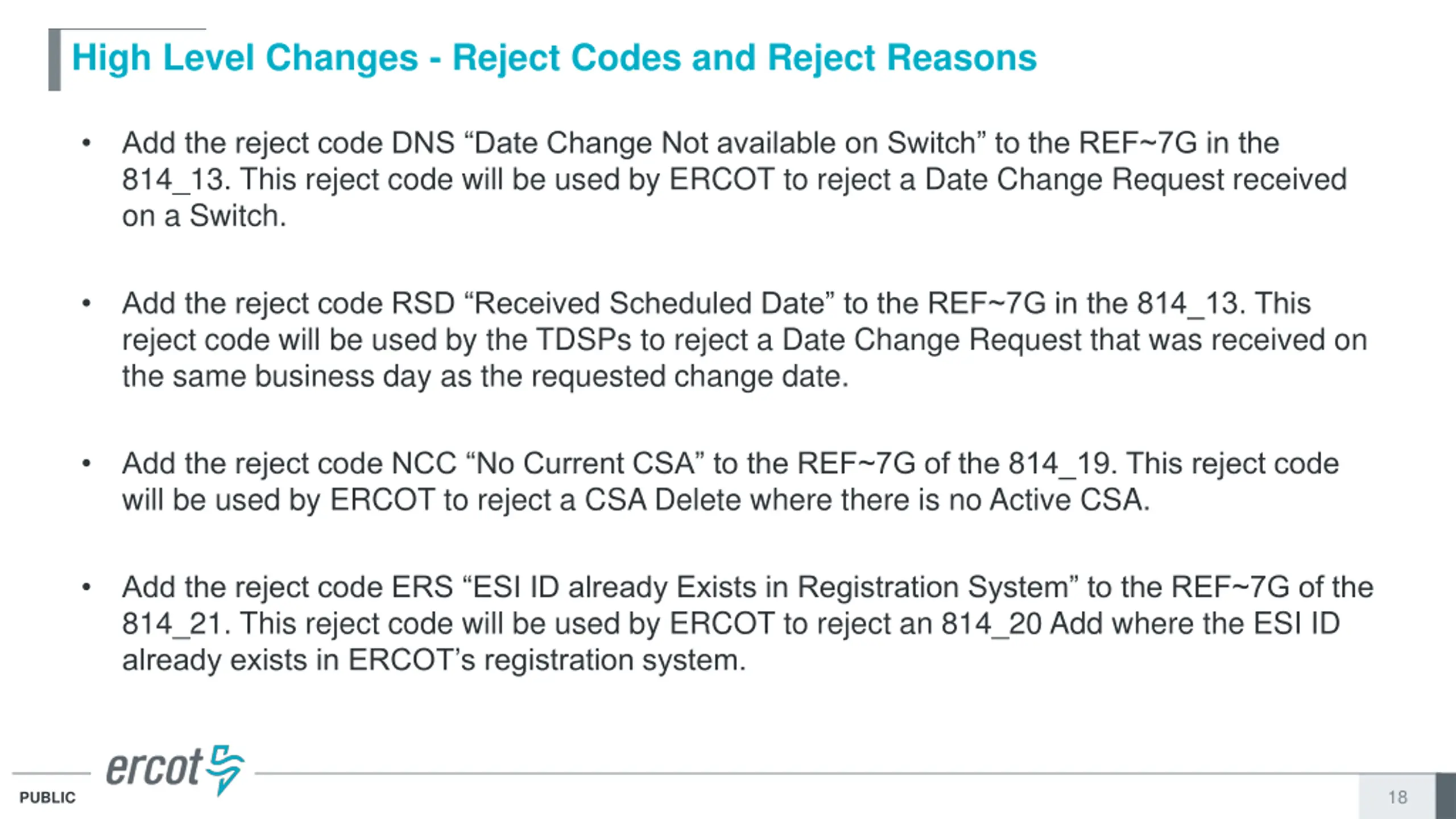 High Level Changes - Reject Codes and Reject Reasons All the reject code SNP Safety Net Pending to be sent on Acquisition Transfers (BGN07=AQ). Add the reject code TMI Invalid Move In on Temporary Service to the REF~7G of the 814_04 and 814_05. This reject code will be used by the TDSPs to reject Move In s due to temporary service. Add the reject code SOP Subsequent Order Processed to the REF~7G of the 814_09. This reject code will be used by the TDSPs to reject a request to cancel due to a subsequent order pending. Add the reject code DCI Date Change Request Ineligible to the REF~7G of the 814_13. This reject code will be used by the TDSPs to reject an invalid date change. 17 PUBLIC