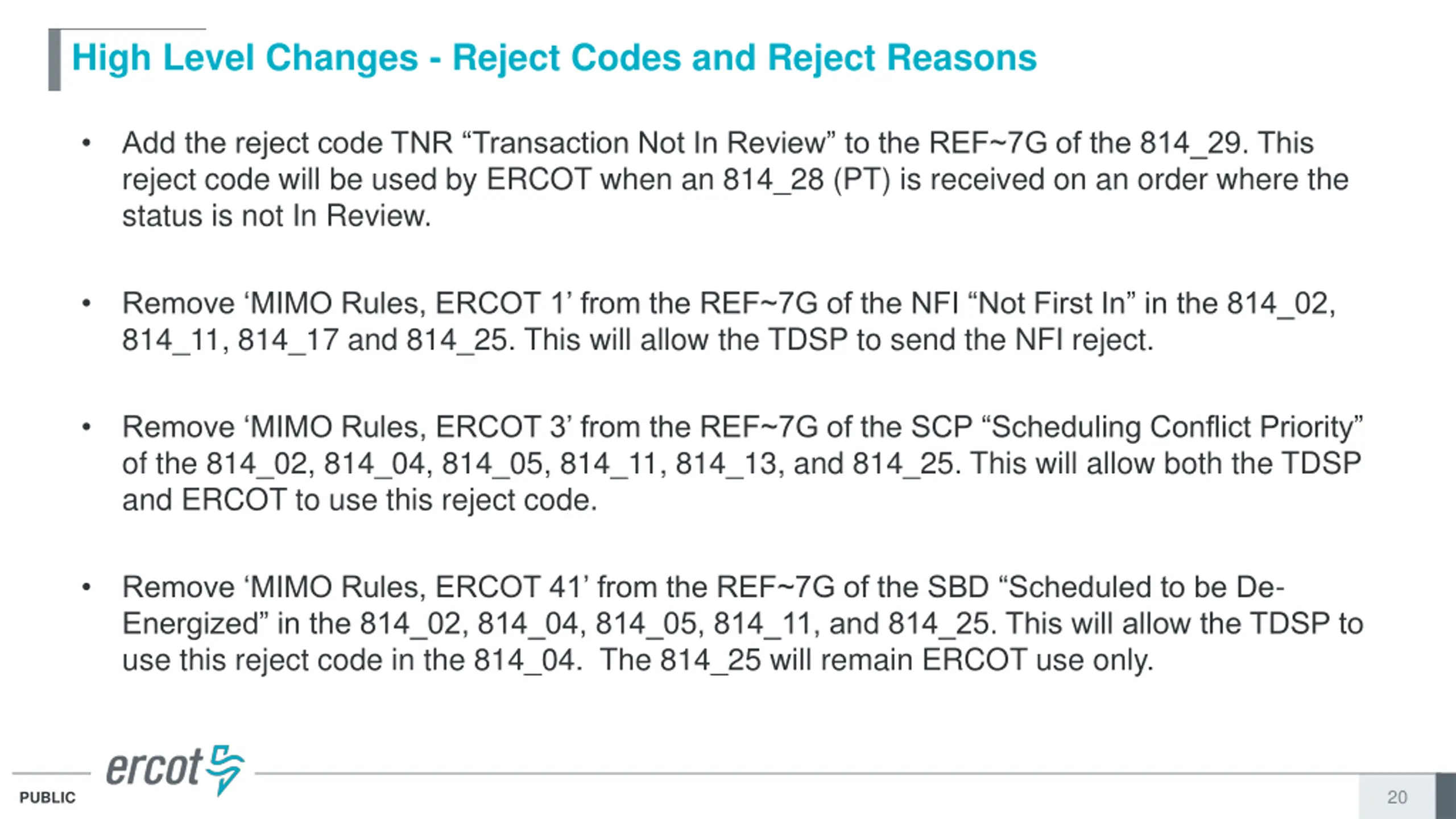 High Level Changes - Reject Codes and Reject Reasons Remove the MIMO Rules, ERCOT 24 from the REF~7G of the IBO Invalid Backdate Originator of the 814_04, 814_05 and 814_25. This will allow the TDSP and ERCOT to send this reject code. Remove Used by ERCOT Only to from the REF~7G of the CW1 Cannot Cancel on the Day of Scheduled Meter Read Date or in the past in the 814_09 and 814_13. This will allow the TDSP to send the CW1 reject code. Remove MIMO Rules, ERCOT 22 from the REF~7G of the ICL Iteration Count Lower in the 814_13. This will allow the TDSP to send the ICL reject code. 21 PUBLIC