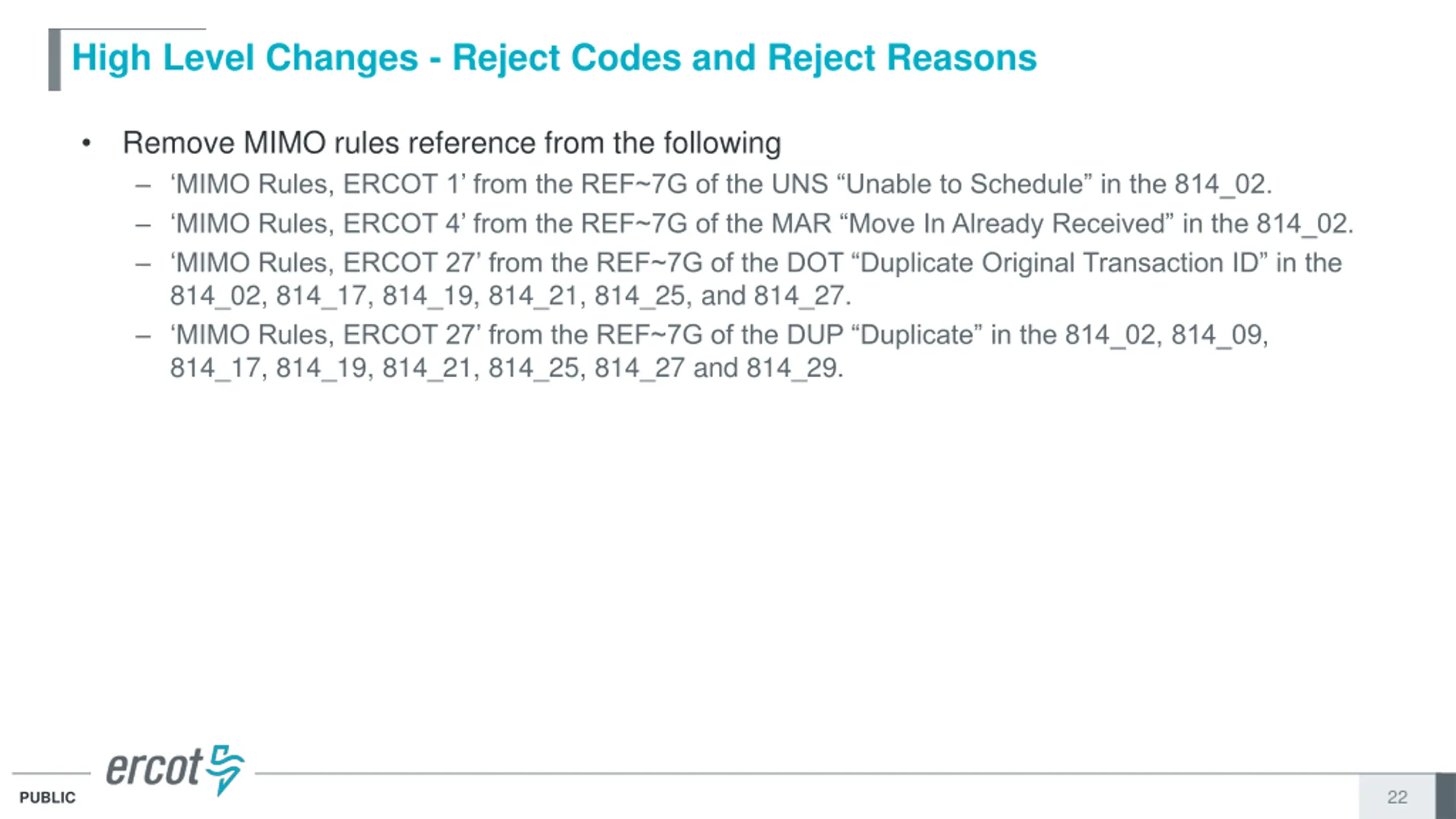 High Level Changes - Reject Codes and Reject Reasons Remove MIMO rules reference from the following MIMO Rules, ERCOT 1 from the REF~7G of the UNS Unable to Schedule in the 814_02. MIMO Rules, ERCOT 4 from the REF~7G of the MAR Move In Already Received in the 814_02. MIMO Rules, ERCOT 27 from the REF~7G of the DOT Duplicate Original Transaction ID in the 814_02, 814_17, 814_19, 814_21, 814_25, and 814_27. MIMO Rules, ERCOT 27 from the REF~7G of the DUP Duplicate in the 814_02, 814_09, 814_17, 814_19, 814_21, 814_25, 814_27 and 814_29. 22 PUBLIC