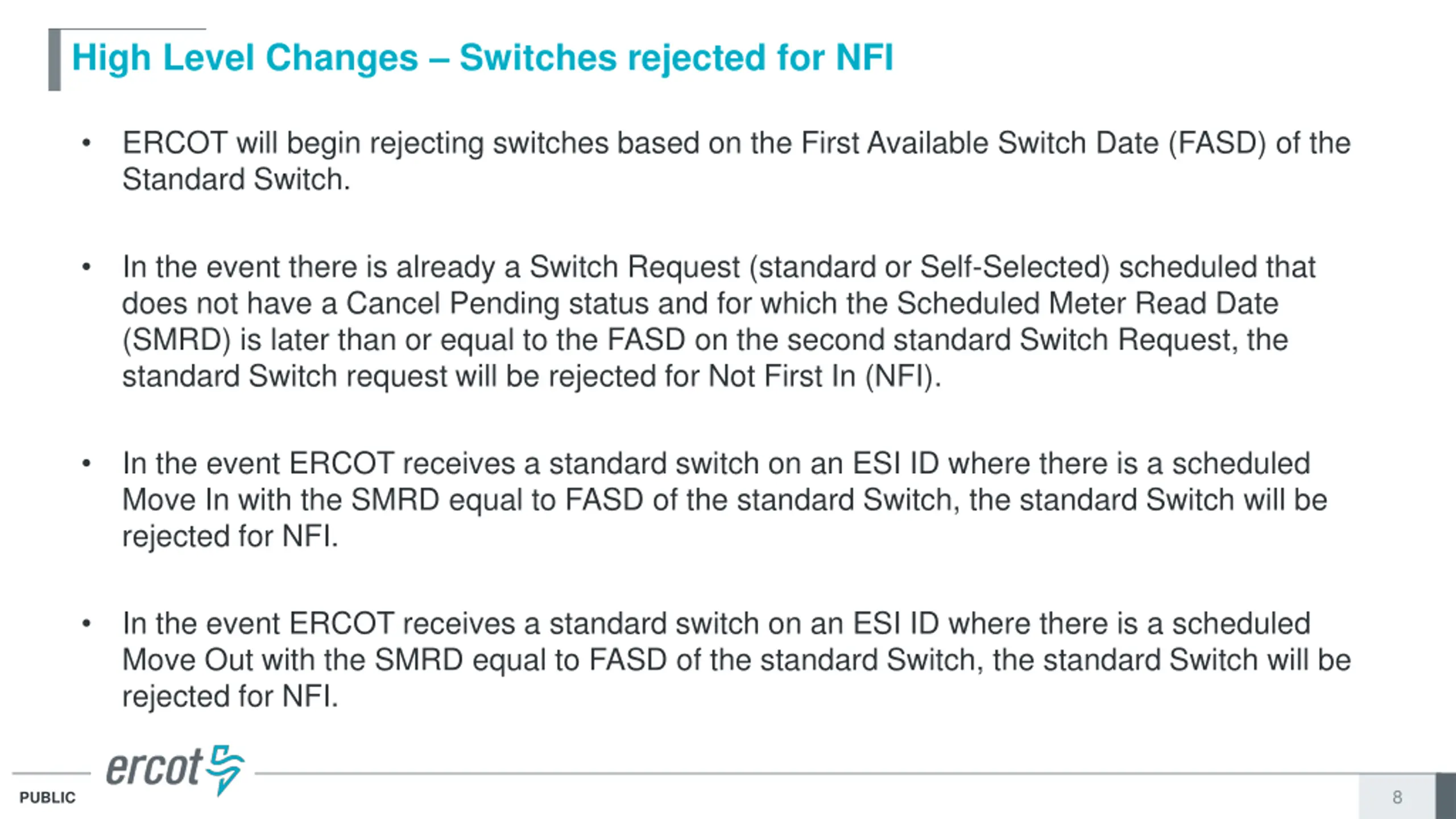High Level Changes Switches rejected for NFI ERCOT will begin rejecting switches based on the First Available Switch Date (FASD) of the Standard Switch. In the event there is already a Switch Request (standard or Self-Selected) scheduled that does not have a Cancel Pending status and for which the Scheduled Meter Read Date (SMRD) is later than or equal to the FASD on the second standard Switch Request, the standard Switch request will be rejected for Not First In (NFI). In the event ERCOT receives a standard switch on an ESI ID where there is a scheduled Move In with the SMRD equal to FASD of the standard Switch, the standard Switch will be rejected for NFI. In the event ERCOT receives a standard switch on an ESI ID where there is a scheduled Move Out with the SMRD equal to FASD of the standard Switch, the standard Switch will be rejected for NFI. 8 PUBLIC