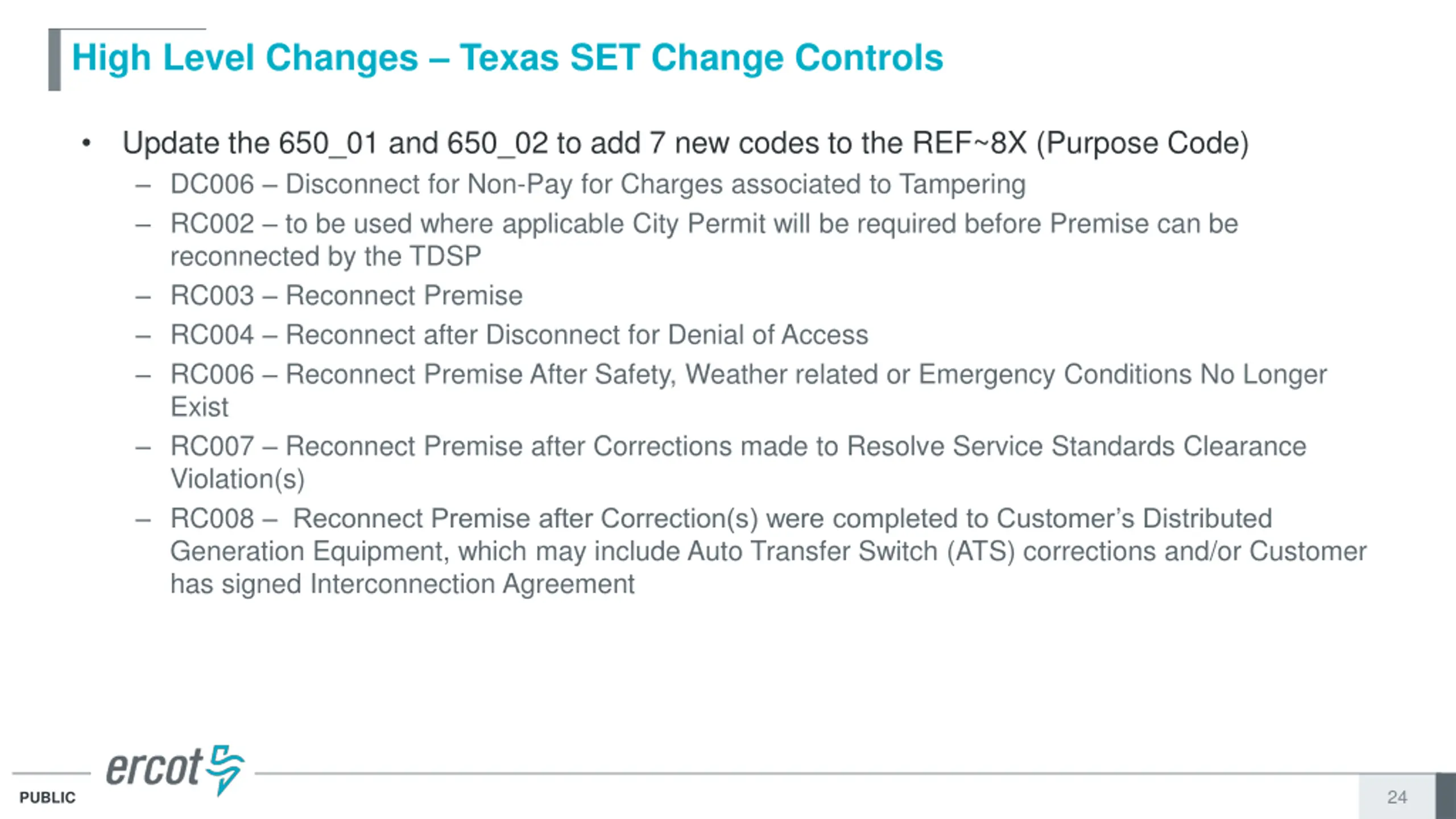 High Level Changes Texas SET Change Controls Make the Unmetered Service Type found in the REF~PRT segment Optional for the TDSP when sending the 814_20 Create. Add the Status Reason CHP (Construction Hold Pending) to the 814_04 and 814_05 of the REF~1P (Status Reason). Update the 650_02 to add 5 new codes to the REF~G7 (Complete Unexecutable Reason) J009 Distributed Generation (DG) Premise requires ATS and signed Interconnection Agreement J010 Auto Transfer Switch (ATS) Not Approved J011 Distributed Generation (DG) Auto Transfer Switch (ATS) Disconnect Not Approved S004 Service Standards Clearance Violation U007 Service Standards Clearance Violation 23 PUBLIC