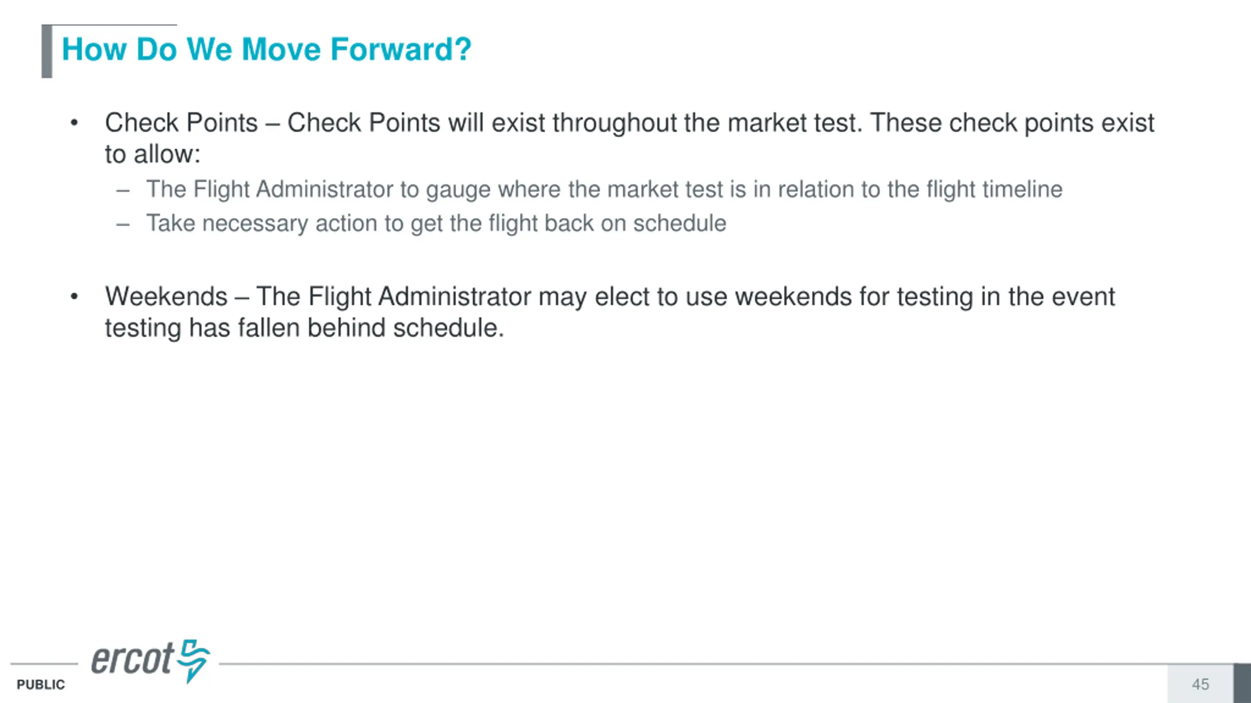 How Do We Move Forward? Check Points Check Points will exist throughout the market test. These check points exist to allow: The Flight Administrator to gauge where the market test is in relation to the flight timeline Take necessary action to get the flight back on schedule Weekends The Flight Administrator may elect to use weekends for testing in the event testing has fallen behind schedule. 45 PUBLIC