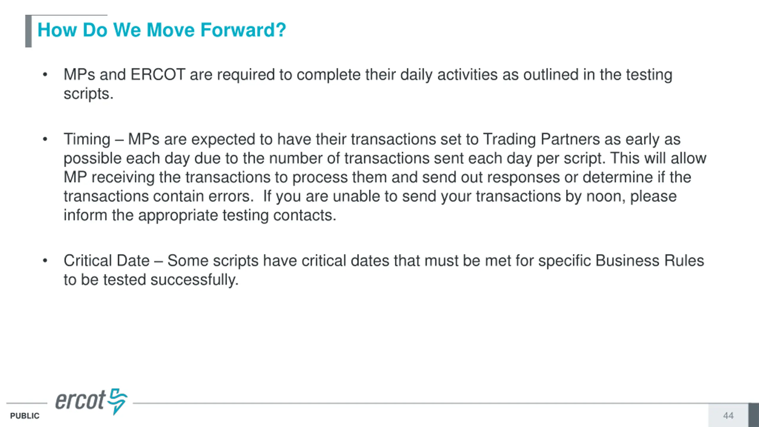 How Do We Move Forward? MPs and ERCOT are required to complete their daily activities as outlined in the testing scripts. Timing MPs are expected to have their transactions set to Trading Partners as early as possible each day due to the number of transactions sent each day per script. This will allow MP receiving the transactions to process them and send out responses or determine if the transactions contain errors. If you are unable to send your transactions by noon, please inform the appropriate testing contacts. Critical Date Some scripts have critical dates that must be met for specific Business Rules to be tested successfully. 44 PUBLIC