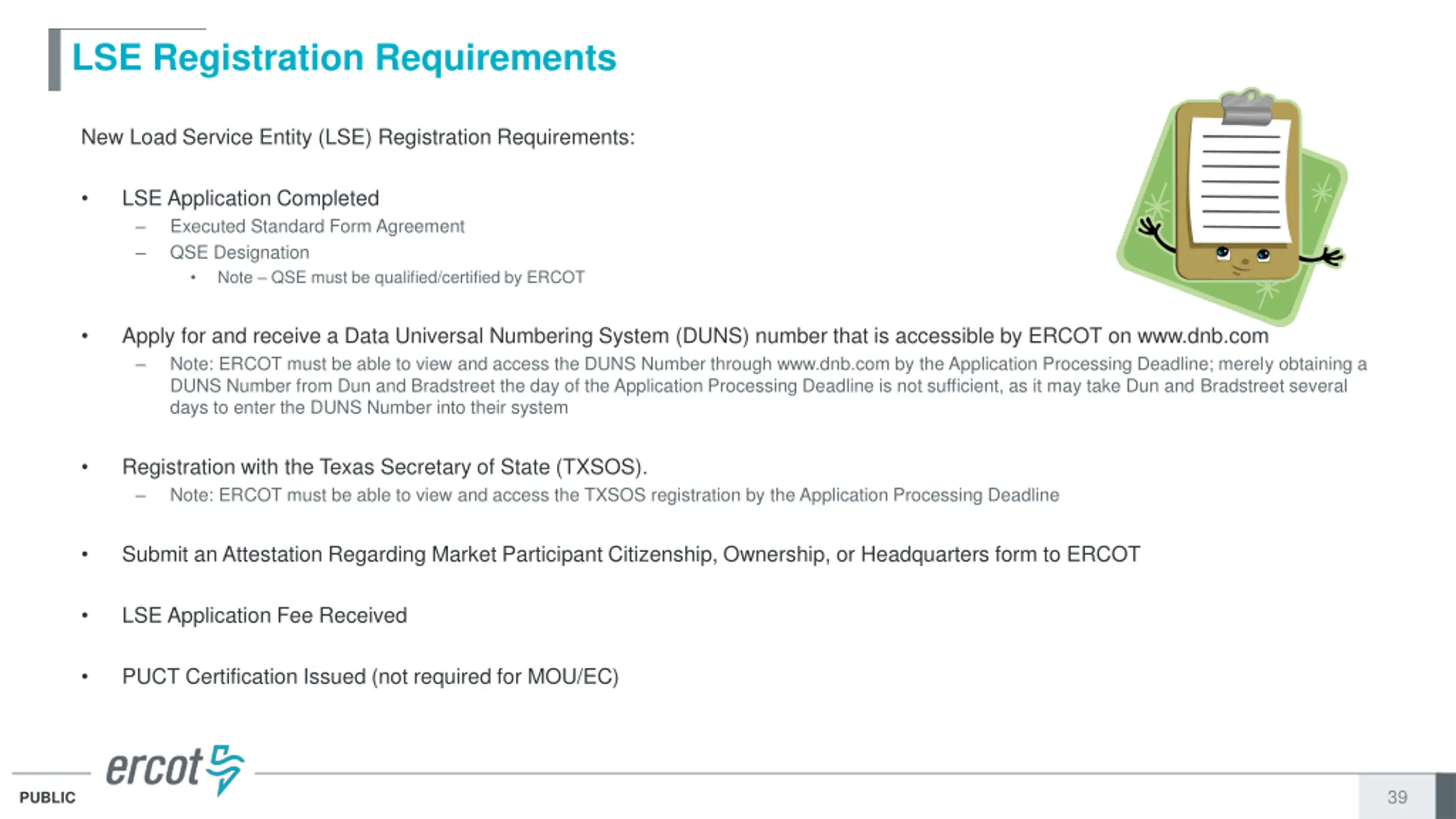 Signing up for Flight 0924: New LSEs New LSEs that wish to sign up for Flight 0924 must complete ALL of the following by Flight Deadline Wednesday, July 3, 2024 5:00 CPT Submit LSE Application Application can be found in Section 23 of the ERCOT Protocols: http://www.ercot.com/mktrules/nprotocols/current QSE Designation must be made prior to production Note QSE must be Qualified/Certified by ERCOT Application requires a DUNS number (www.dnb.com). Note: ERCOT must be able to view and access the DUNS Number through www.dnb.com by the Application Processing Deadline; merely obtaining a DUNS Number from Dun and Bradstreet the day of the Application Processing Deadline is not sufficient, as it may take Dun and Bradstreet several days to enter the DUNS Number into their system Please not that proper registration of your company must be on file at the Texas Secretary of State office in order for your ERCOT LSE application to be accepted (http://www.sos.state.tx.us/) . Note: ERCOT must be able to view and access the TXSOS registration by the Application Processing Deadline Submit an Attestation Regarding Market Participant Citizenship, Ownership, or Headquarters form to ERCOT 33 PUBLIC