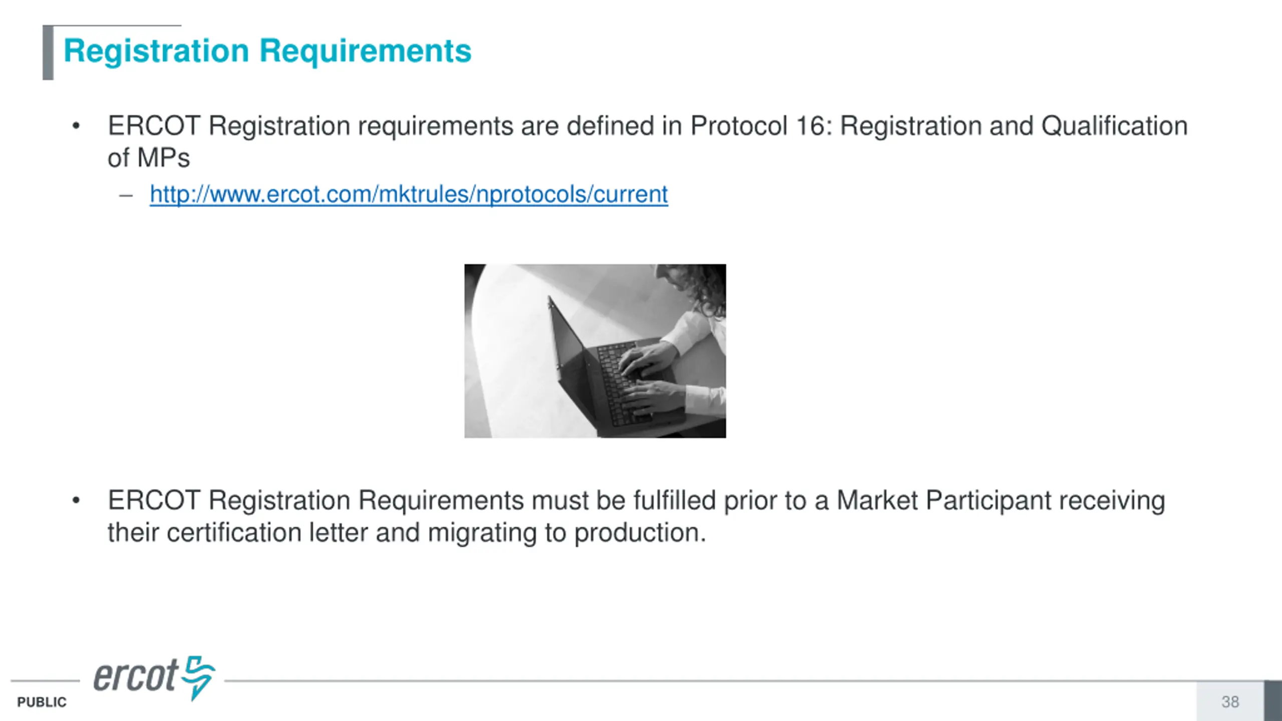 Registration Requirements ERCOT Registration requirements are defined in Protocol 16: Registration and Qualification of MPs http://www.ercot.com/mktrules/nprotocols/current ERCOT Registration Requirements must be fulfilled prior to a Market Participant receiving their certification letter and migrating to production. 38 PUBLIC