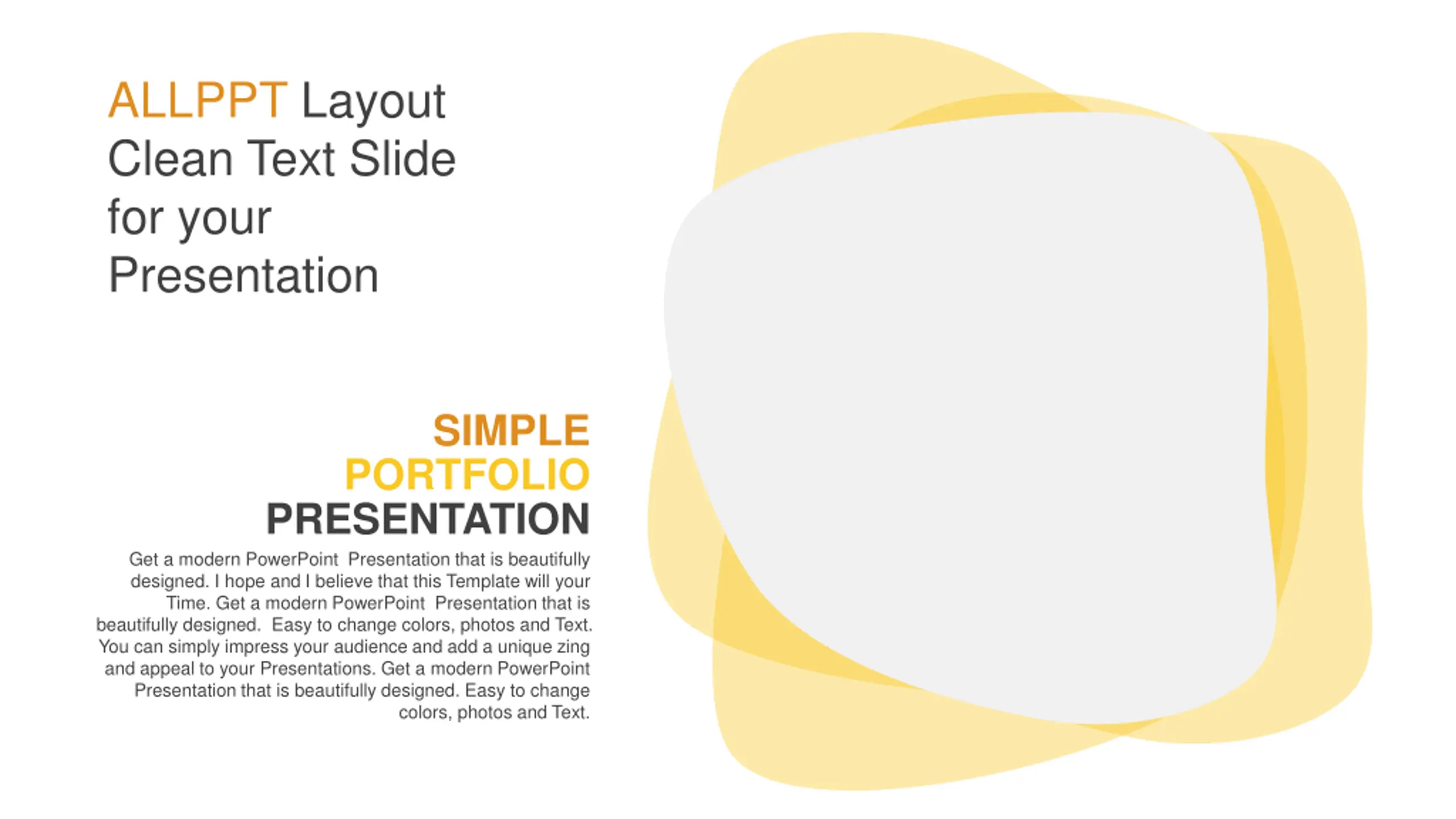 ALLPPT Layout Clean Text Slide for your Presentation SIMPLE PORTFOLIO PRESENTATION Get a modern PowerPoint Presentation that is beautifully designed. I hope and I believe that this Template will your Time. Get a modern PowerPoint Presentation that is beautifully designed. Easy to change colors, photos and Text. You can simply impress your audience and add a unique zing and appeal to your Presentations. Get a modern PowerPoint Presentation that is beautifully designed. Easy to change colors, photos and Text.