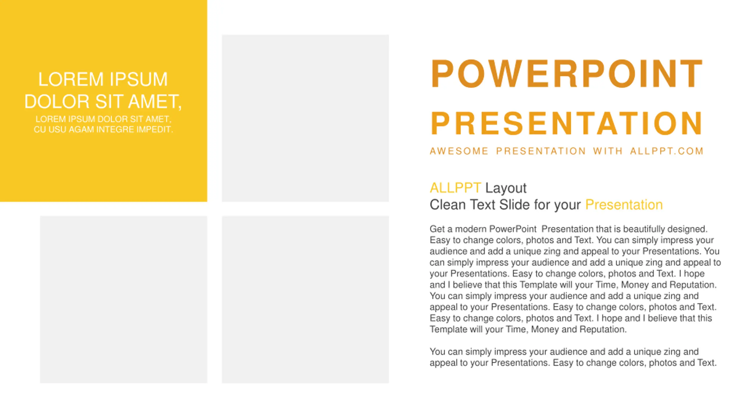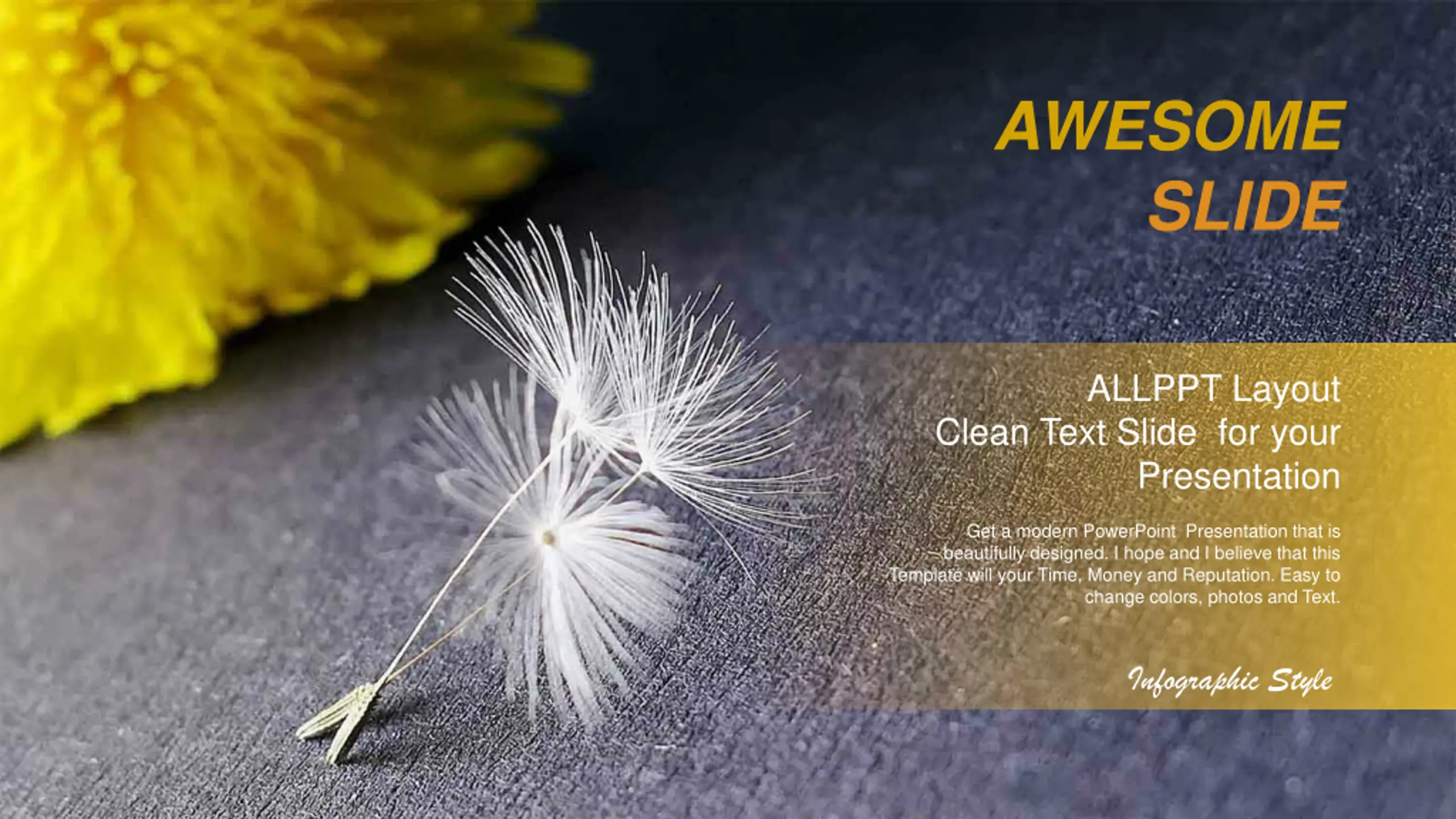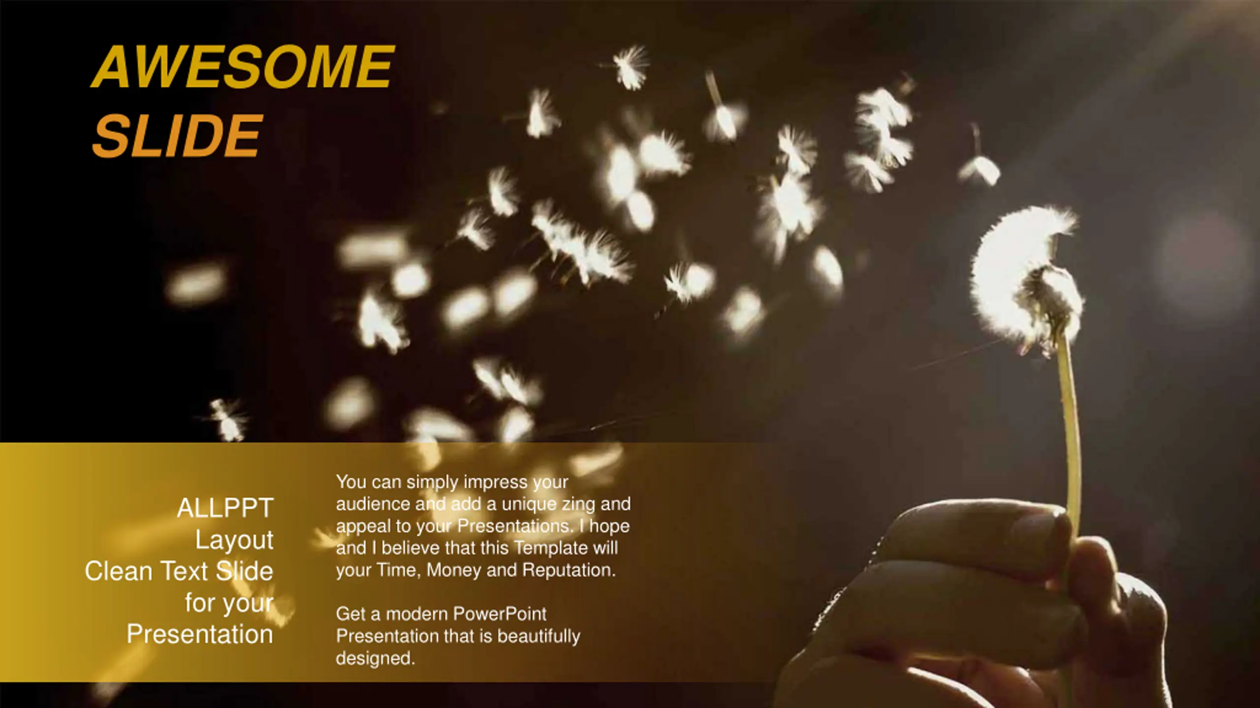 AWESOME SLIDE ALLPPT Layout Clean Text Slide for your Presentation Get a modern PowerPoint Presentation that is beautifully designed. I hope and I believe that this Template will your Time, Money and Reputation. Easy to change colors, photos and Text.