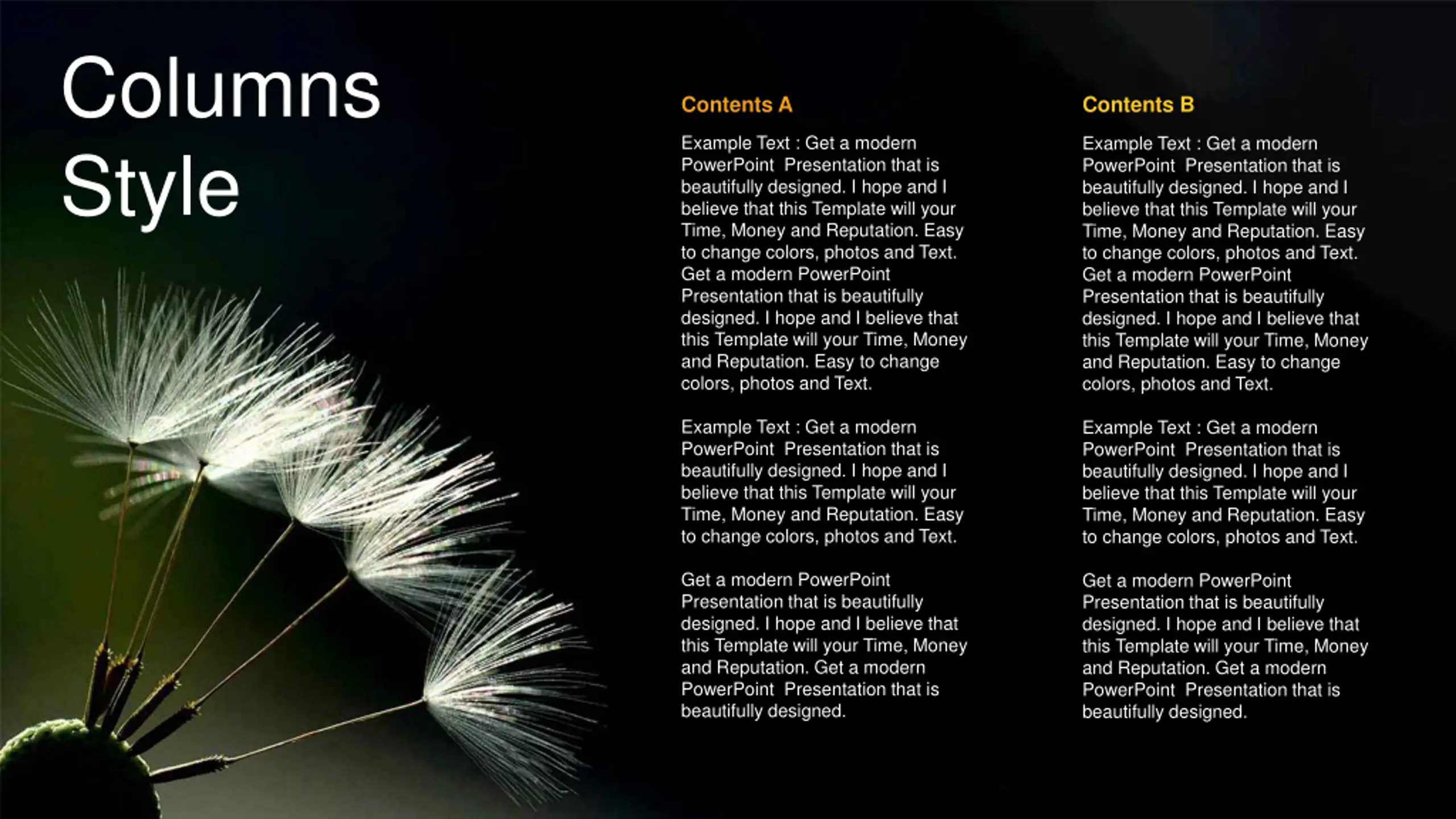 Columns Style Contents A Contents B Example Text : Get a modern PowerPoint Presentation that is beautifully designed. I hope and I believe that this Template will your Time, Money and Reputation. Easy to change colors, photos and Text. Get a modern PowerPoint Presentation that is beautifully designed. I hope and I believe that this Template will your Time, Money and Reputation. Easy to change colors, photos and Text. Example Text : Get a modern PowerPoint Presentation that is beautifully designed. I hope and I believe that this Template will your Time, Money and Reputation. Easy to change colors, photos and Text. Get a modern PowerPoint Presentation that is beautifully designed. I hope and I believe that this Template will your Time, Money and Reputation. Easy to change colors, photos and Text. Example Text : Get a modern PowerPoint Presentation that is beautifully designed. I hope and I believe that this Template will your Time, Money and Reputation. Easy to change colors, photos and Text. Example Text : Get a modern PowerPoint Presentation that is beautifully designed. I hope and I believe that this Template will your Time, Money and Reputation. Easy to change colors, photos and Text. Get a modern PowerPoint Presentation that is beautifully designed. I hope and I believe that this Template will your Time, Money and Reputation. Get a modern PowerPoint Presentation that is beautifully designed. Get a modern PowerPoint Presentation that is beautifully designed. I hope and I believe that this Template will your Time, Money and Reputation. Get a modern PowerPoint Presentation that is beautifully designed.