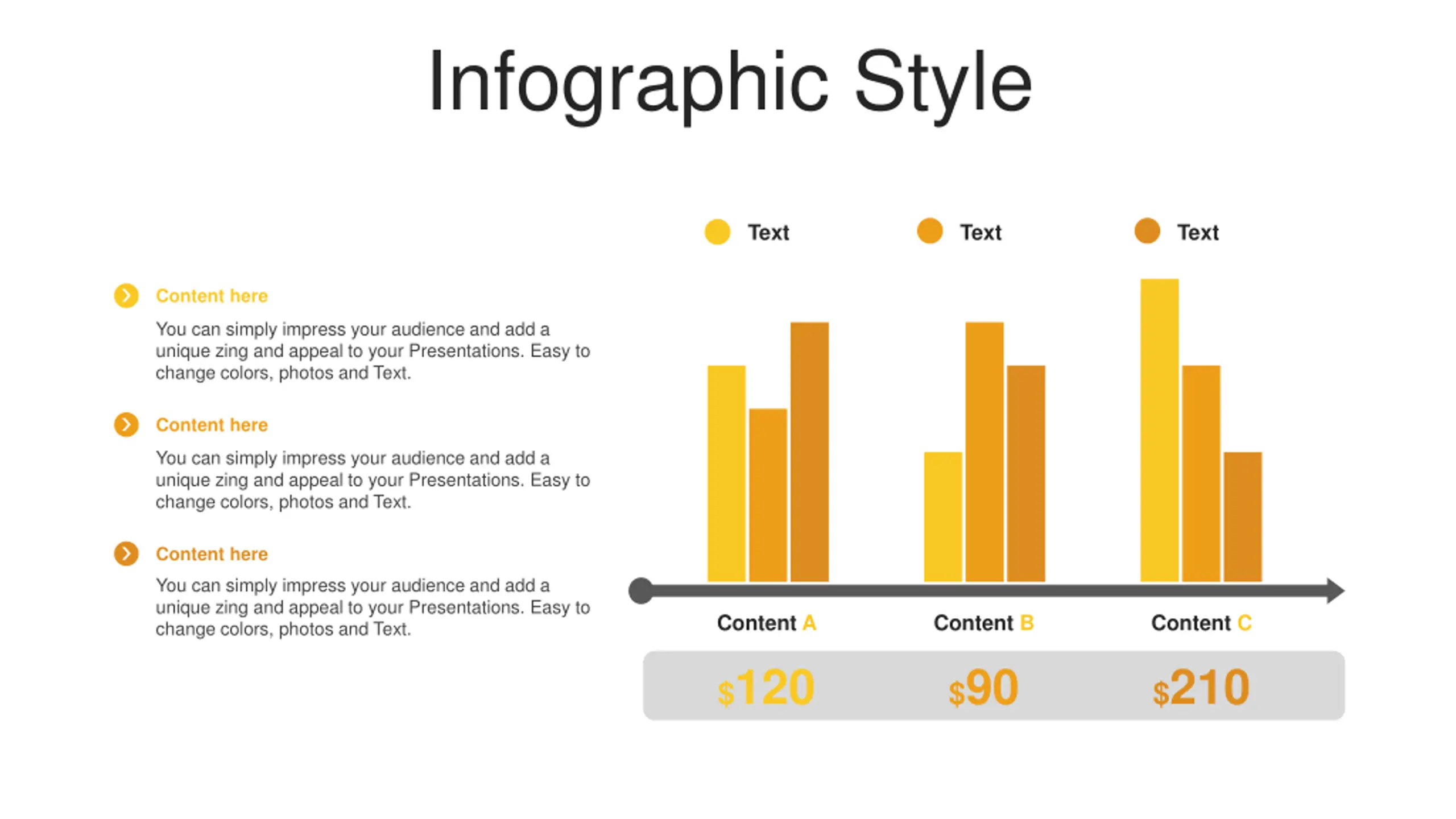 Infographic Style Text Text Text Content here You can simply impress your audience and add a unique zing and appeal to your Presentations. Easy to change colors, photos and Text. Content here You can simply impress your audience and add a unique zing and appeal to your Presentations. Easy to change colors, photos and Text. Content here You can simply impress your audience and add a unique zing and appeal to your Presentations. Easy to change colors, photos and Text. Content A Content B Content C $120 $90 $210