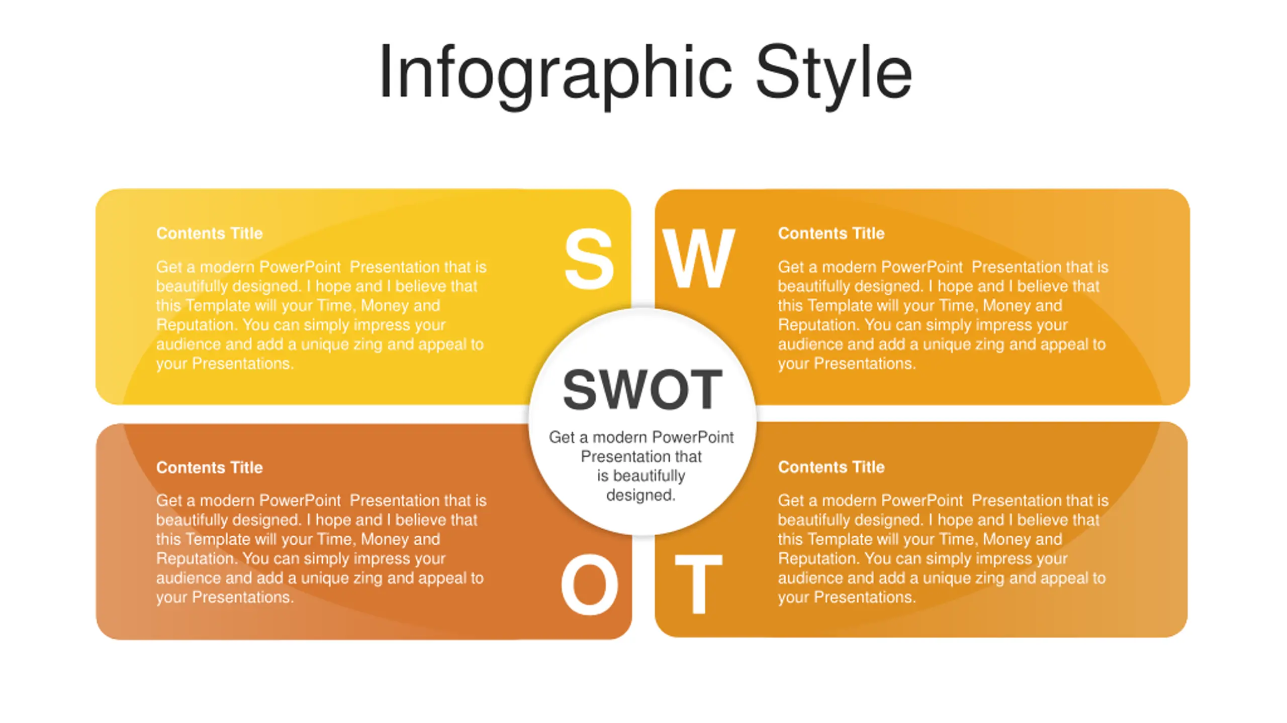 Infographic Style S W Contents Title Contents Title Get a modern PowerPoint Presentation that is beautifully designed. I hope and I believe that this Template will your Time, Money and Reputation. You can simply impress your audience and add a unique zing and appeal to your Presentations. Get a modern PowerPoint Presentation that is beautifully designed. I hope and I believe that this Template will your Time, Money and Reputation. You can simply impress your audience and add a unique zing and appeal to your Presentations. SWOT Get a modern PowerPoint Presentation that is beautifully designed. Contents Title Contents Title Get a modern PowerPoint Presentation that is beautifully designed. I hope and I believe that this Template will your Time, Money and Reputation. You can simply impress your audience and add a unique zing and appeal to your Presentations. Get a modern PowerPoint Presentation that is beautifully designed. I hope and I believe that this Template will your Time, Money and Reputation. You can simply impress your audience and add a unique zing and appeal to your Presentations. O T