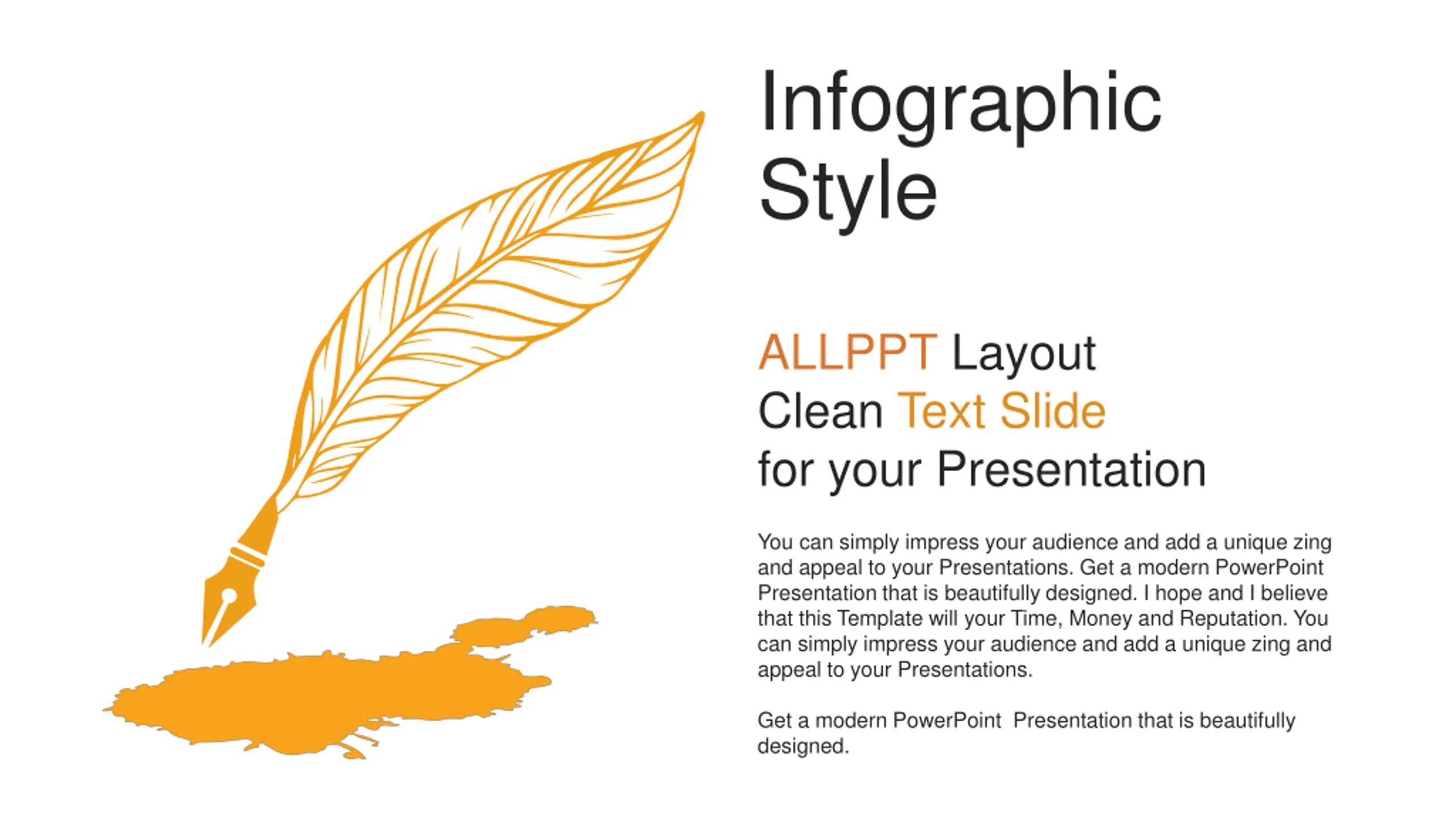 Infographic Style ALLPPT Layout Clean Text Slide for your Presentation You can simply impress your audience and add a unique zing and appeal to your Presentations. Get a modern PowerPoint Presentation that is beautifully designed. I hope and I believe that this Template will your Time, Money and Reputation. You can simply impress your audience and add a unique zing and appeal to your Presentations. Get a modern PowerPoint Presentation that is beautifully designed.