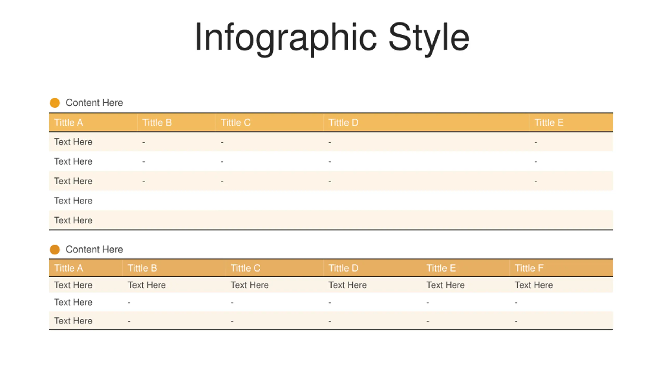 Infographic Style Content Here Tittle A Tittle B Tittle C Tittle D Tittle E Text Here - - - - Text Here - - - - Text Here - - - - Text Here Text Here Content Here Tittle A Tittle B Tittle C Tittle D Tittle E Tittle F Text Here Text Here Text Here Text Here Text Here Text Here Text Here - - - - - Text Here - - - - -