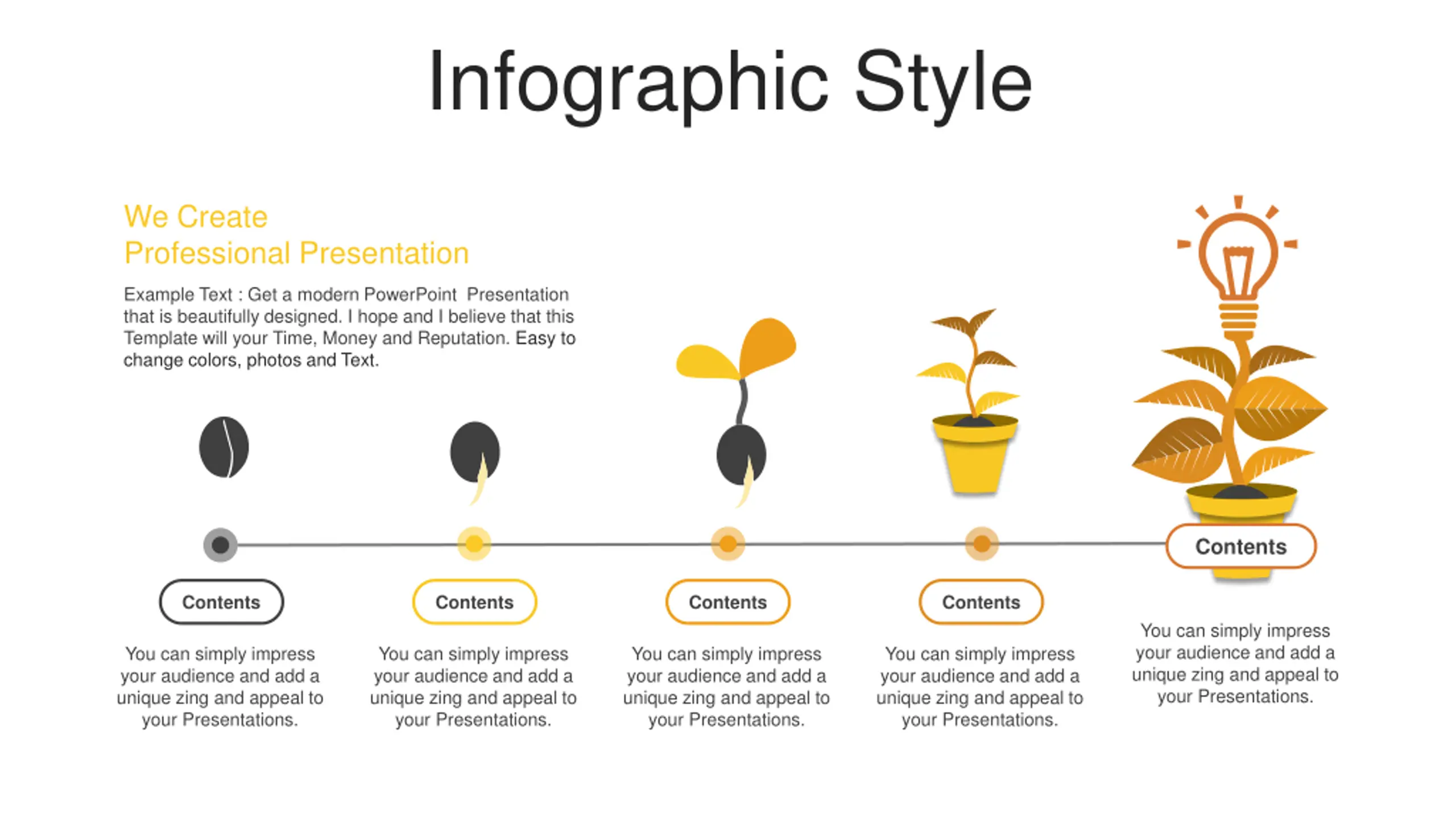 Infographic Style We Create Professional Presentation Example Text : Get a modern PowerPoint Presentation that is beautifully designed. I hope and I believe that this Template will your Time, Money and Reputation. Easy to change colors, photos and Text. Contents Contents Contents Contents Contents You can simply impress your audience and add a unique zing and appeal to your Presentations. You can simply impress your audience and add a unique zing and appeal to your Presentations. You can simply impress your audience and add a unique zing and appeal to your Presentations. You can simply impress your audience and add a unique zing and appeal to your Presentations. You can simply impress your audience and add a unique zing and appeal to your Presentations.