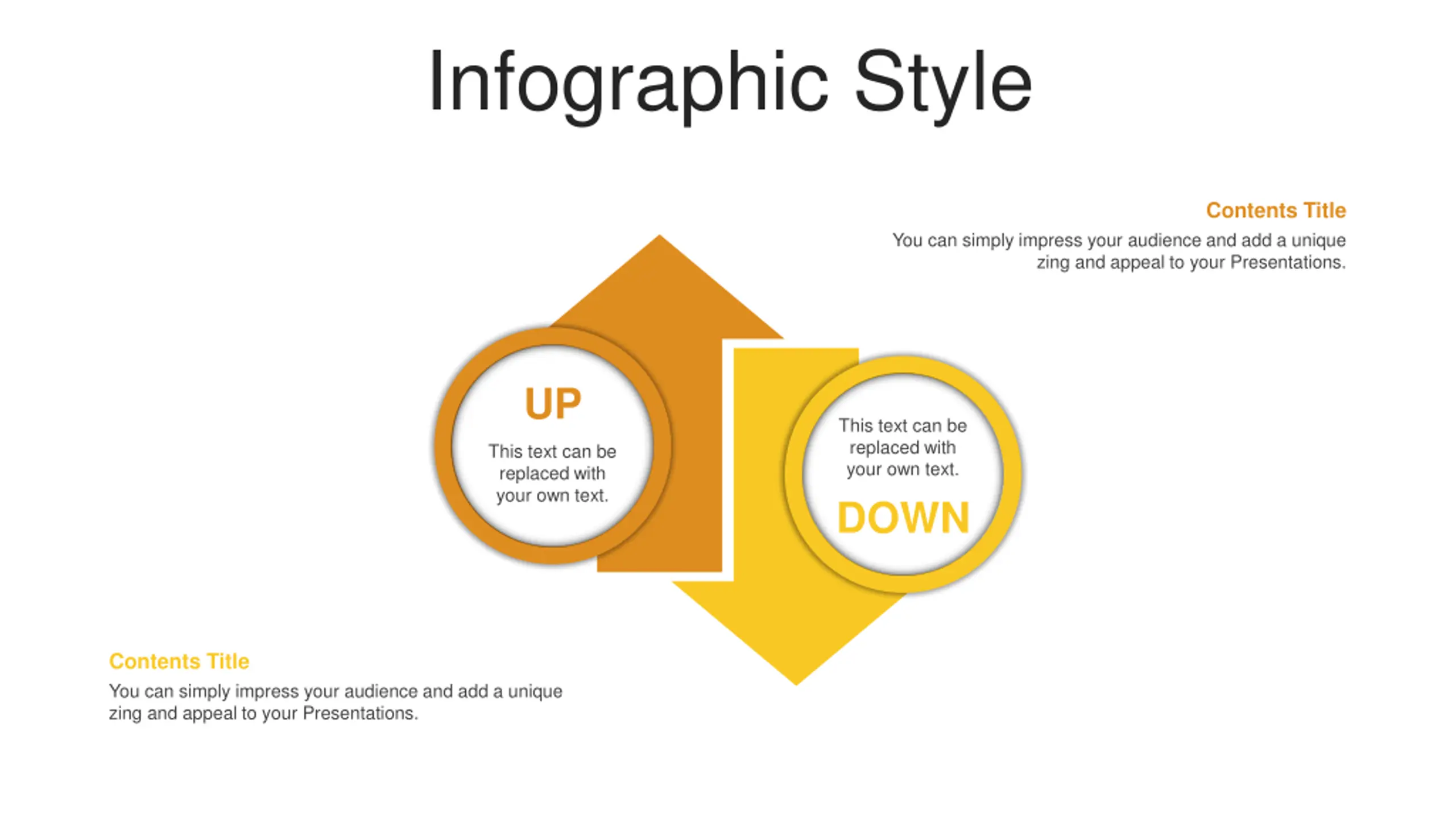 Infographic Style Contents Title You can simply impress your audience and add a unique zing and appeal to your Presentations. UP This text can be replaced with your own text. This text can be replaced with your own text. DOWN Contents Title You can simply impress your audience and add a unique zing and appeal to your Presentations.