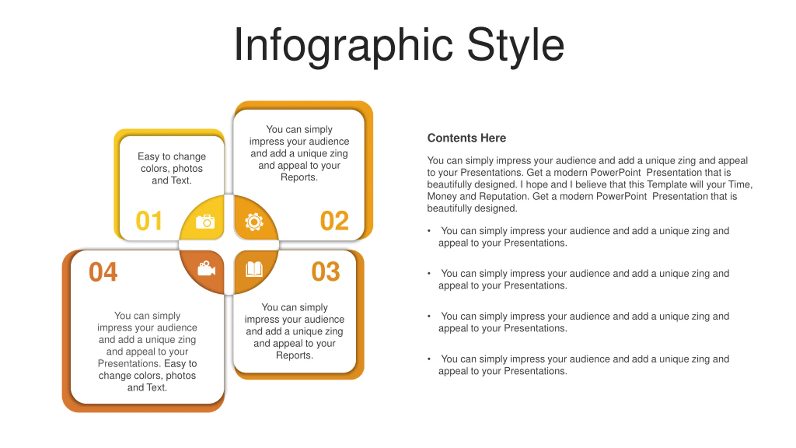 Infographic Style Contents Contents Contents Contents You can simply impress your audience and add a unique zing and appeal to your Reports You can simply impress your audience and add a unique zing and appeal to your Reports You can simply impress your audience and add a unique zing and appeal to your Reports You can simply impress your audience and add a unique zing and appeal to your Reports Contents Here Contents Here Contents Here Contents Here Get a modern PowerPoint Presentation that is beautifully designed. You can simply impress your audience and add a unique zing and appeal to your Presentations. Get a modern PowerPoint Presentation that is beautifully designed. You can simply impress your audience and add a unique zing and appeal to your Presentations. Get a modern PowerPoint Presentation that is beautifully designed. You can simply impress your audience and add a unique zing and appeal to your Presentations. Get a modern PowerPoint Presentation that is beautifully designed. You can simply impress your audience and add a unique zing and appeal to your Presentations.