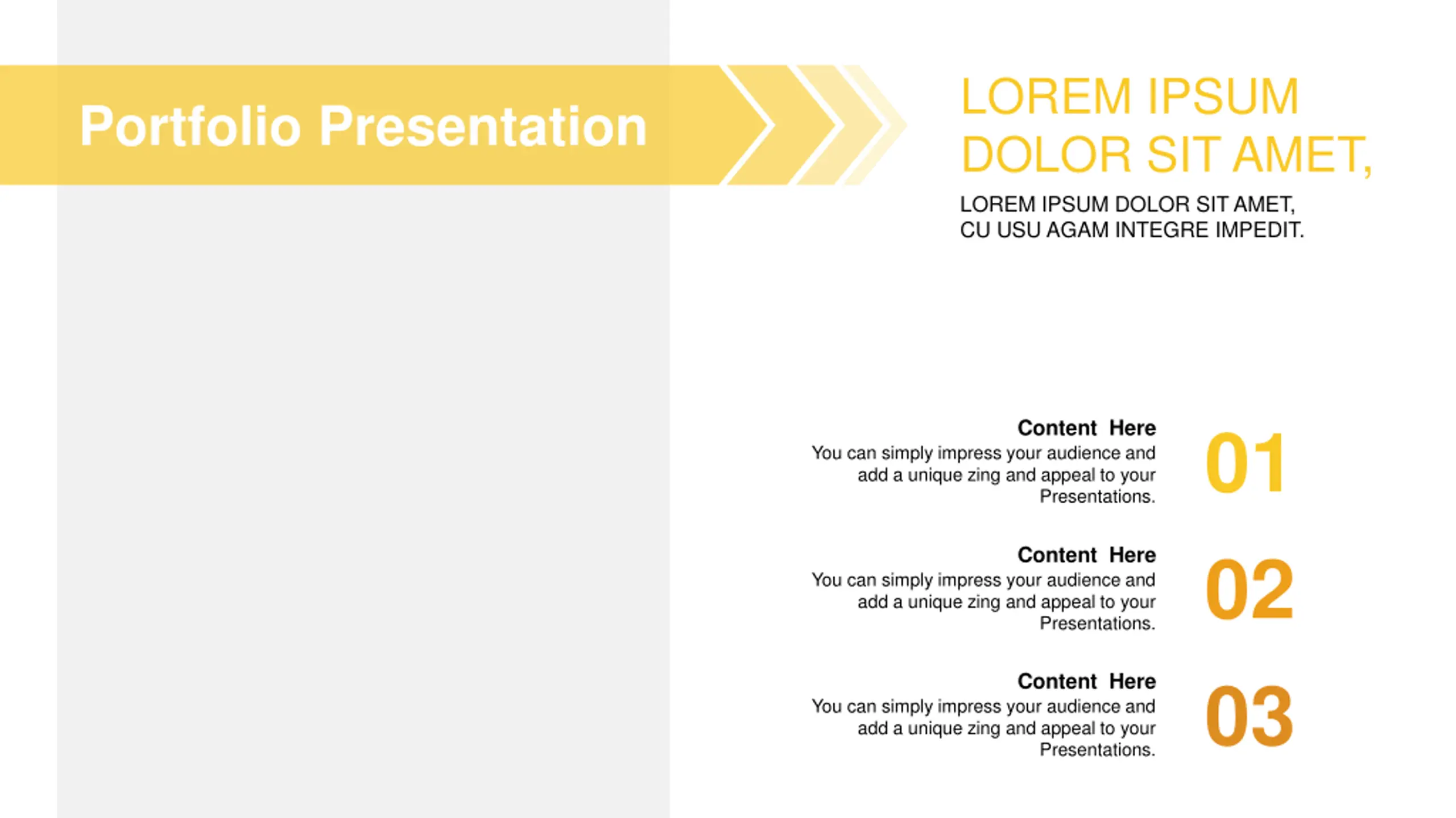 LOREM IPSUM DOLOR SIT AMET, Portfolio Presentation LOREM IPSUM DOLOR SIT AMET, CU USU AGAM INTEGRE IMPEDIT. 01 02 03 Content Here You can simply impress your audience and add a unique zing and appeal to your Presentations. Content Here You can simply impress your audience and add a unique zing and appeal to your Presentations. Content Here You can simply impress your audience and add a unique zing and appeal to your Presentations.