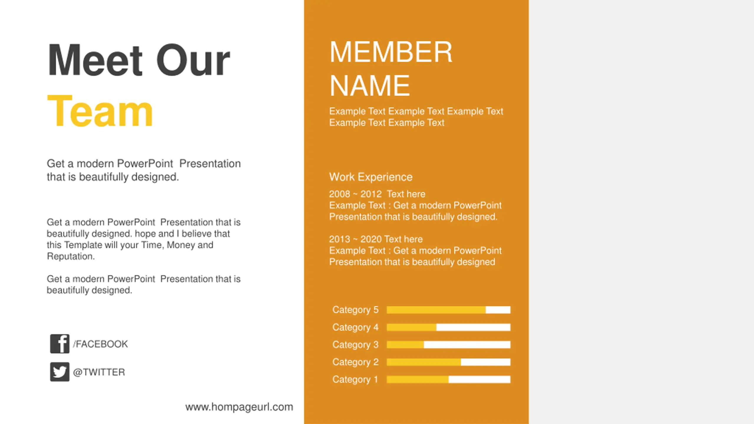 Meet Our Team MEMBER NAME Example Text Example Text Example Text Example Text Example Text Get a modern PowerPoint Presentation that is beautifully designed. Work Experience 2008 ~ 2012 Text here Example Text : Get a modern PowerPoint Presentation that is beautifully designed. Get a modern PowerPoint Presentation that is beautifully designed. hope and I believe that this Template will your Time, Money and Reputation. 2013 ~ 2020 Text here Example Text : Get a modern PowerPoint Presentation that is beautifully designed Get a modern PowerPoint Presentation that is beautifully designed. Category 5 Category 4 /FACEBOOK Category 3 Category 2 @TWITTER Category 1 www.hompageurl.com