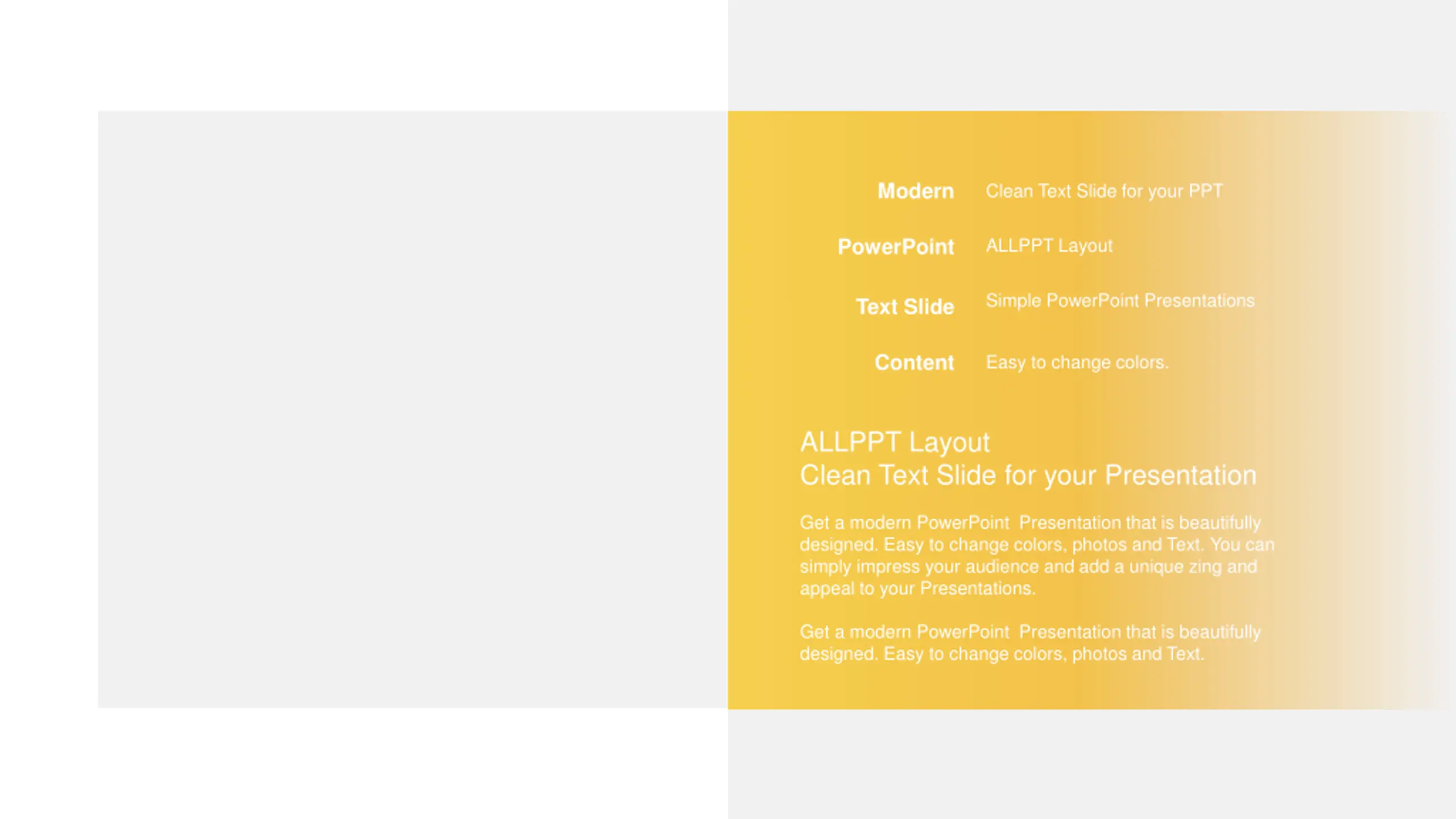 Modern Clean Text Slide for your PPT PowerPoint ALLPPT Layout Simple PowerPoint Presentations Text Slide Content Easy to change colors. ALLPPT Layout Clean Text Slide for your Presentation Get a modern PowerPoint Presentation that is beautifully designed. Easy to change colors, photos and Text. You can simply impress your audience and add a unique zing and appeal to your Presentations. Get a modern PowerPoint Presentation that is beautifully designed. Easy to change colors, photos and Text.