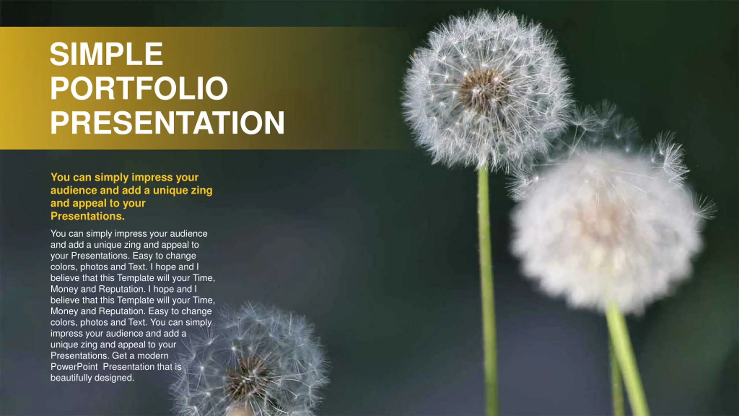 Simple Portfolio Presentation You can simply impress your audience and add a unique zing and appeal to your Presentations. You can simply impress your audience and add a unique zing and appeal to your Presentations. Easy to change colors, photos and Text. Get a modern PowerPoint Presentation that is beautifully designed. Get a modern PowerPoint Presentation that is beautifully designed. I hope and I believe that this Template will your Time, Money and Reputation. You can simply impress your audience and add a unique zing and appeal to your Presentations. Get a modern PowerPoint Presentation that is beautifully designed. Get a modern PowerPoint Presentation that is beautifully designed. I hope and I believe that this Template will your Time, Money and Reputation. You can simply impress your audience and add a unique zing and appeal to your Presentations. Get a modern PowerPoint Presentation that is beautifully designed Easy to change colors, photos and Text. Get a modern PowerPoint Presentation that is beautifully designed.