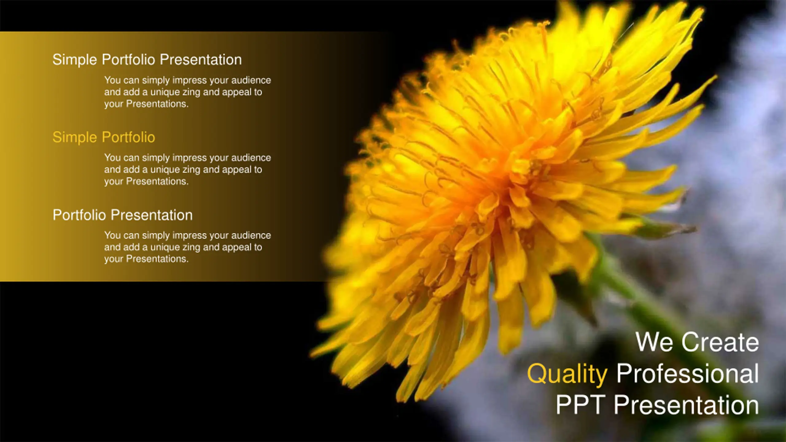 Simple Portfolio Presentation You can simply impress your audience and add a unique zing and appeal to your Presentations. Simple Portfolio You can simply impress your audience and add a unique zing and appeal to your Presentations. Portfolio Presentation You can simply impress your audience and add a unique zing and appeal to your Presentations. We Create Quality Professional PPT Presentation