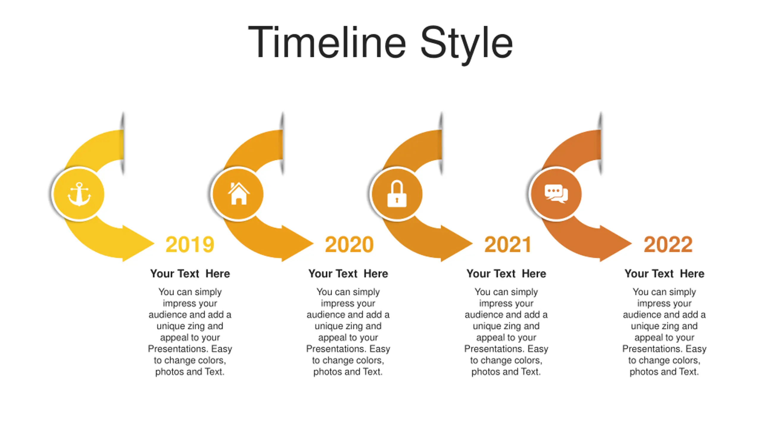 Timeline Style 2019 2020 2021 2022 Your Text Here Your Text Here Your Text Here Your Text Here You can simply impress your audience and add a unique zing and appeal to your Presentations. Easy to change colors, photos and Text. You can simply impress your audience and add a unique zing and appeal to your Presentations. Easy to change colors, photos and Text. You can simply impress your audience and add a unique zing and appeal to your Presentations. Easy to change colors, photos and Text. You can simply impress your audience and add a unique zing and appeal to your Presentations. Easy to change colors, photos and Text.