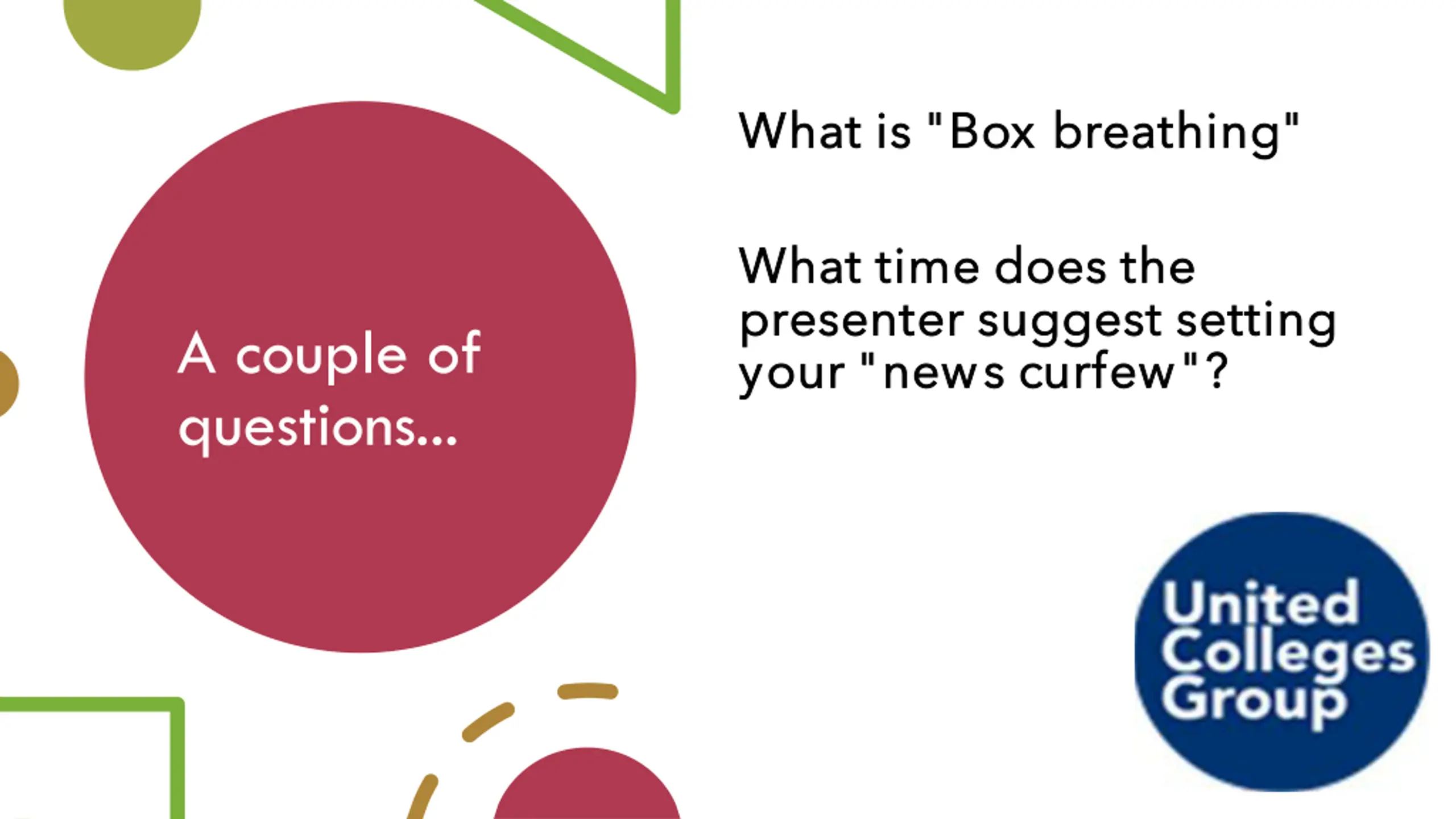 What is "Box breathing" What is "Box breathing" What time does the What time does the presenter suggest setting presenter suggest setting your "news curfew"? your "news curfew"? A couple of questions...