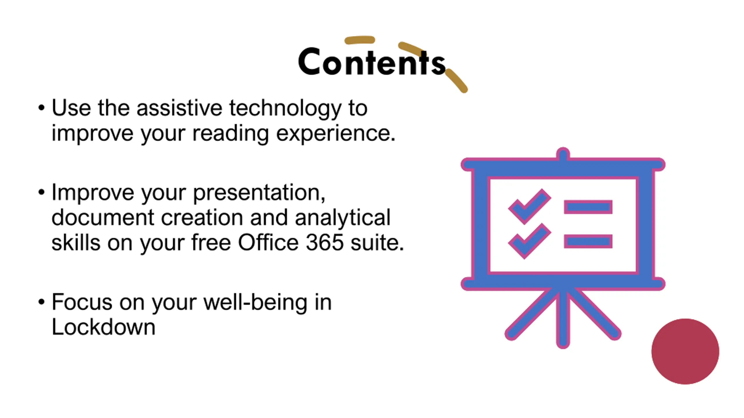 Contents Use the assistive technology to improve your reading experience. Improve your presentation, document creation and analytical skills on your free Office 365 suite. Focus on your well-being in Lockdown