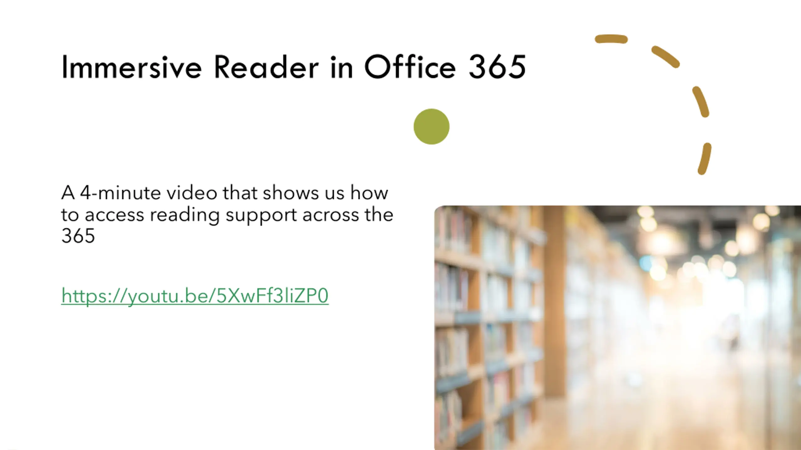 Immersive Reader in Office 365 A 4-minute video that shows us how to access reading support across the 365 https://youtu.be/5XwFf3liZP0