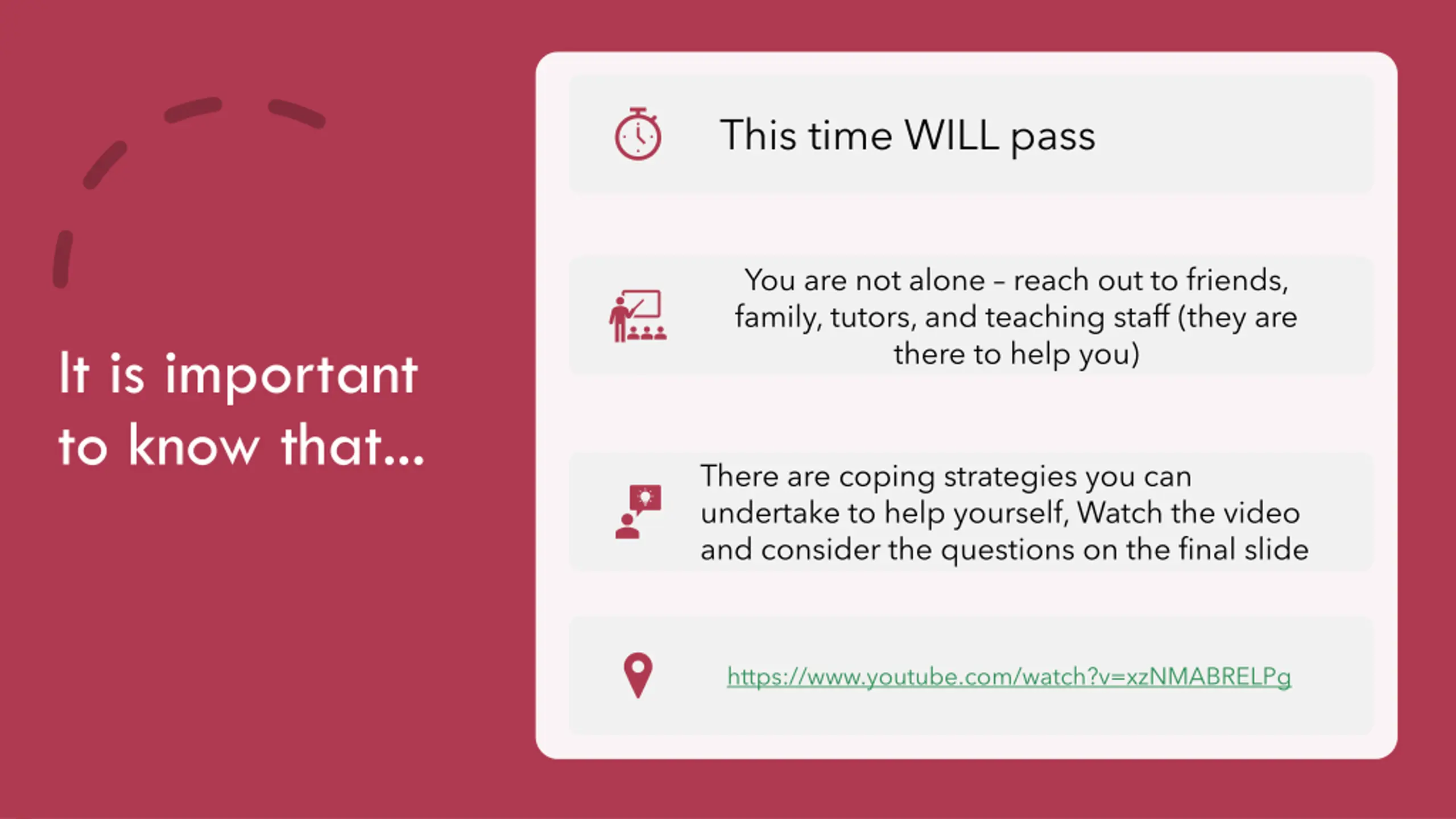 This time WILL pass You are not alone reach out to friends, family, tutors, and teaching staff (they are there to help you) It is important to know that... There are coping strategies you can undertake to help yourself, Watch the video and consider the questions on the final slide https://www.youtube.com/watch?v=xzNMABRELPg https://www.youtube.com/watch?v=xzNMABRELPg
